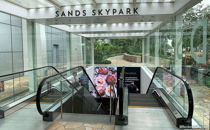 표시를 따라 1층 입구를 나서게 되면 SANDS SKYPARK 입구로 내려가는 에스컬레이터가 나타납니다. 에스컬레이터를 타고 내려가면 스카이파크로 갈 수 있는 입구 및 매표소가 나타납니다.