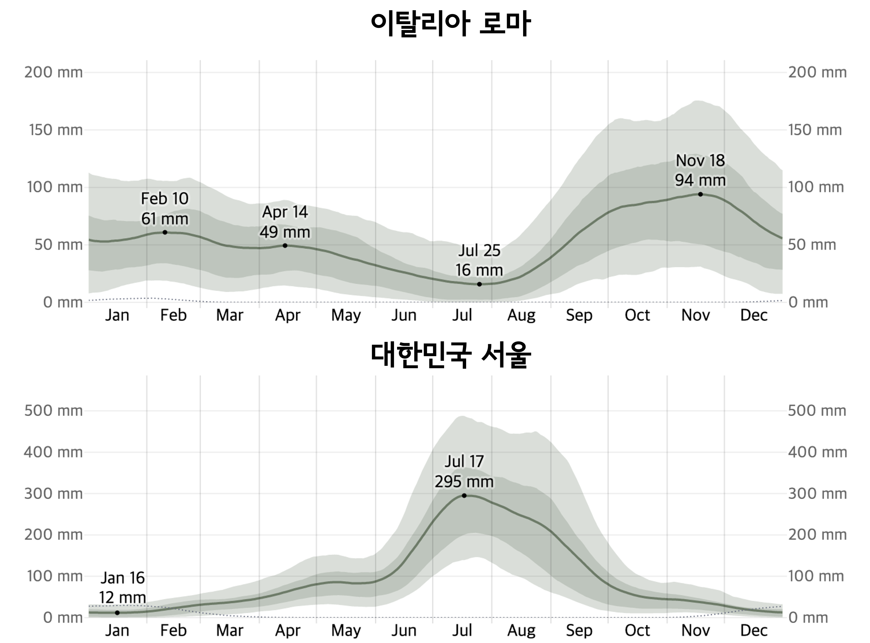 한국의 경우 6월부터 9월 사이에 비가 집중해서 내리는 것에 비해, 이탈리아 로마에는 일 년 내내 비가 내립니다. 로마에서 비가 가장 많이 내리는 달은 11월로 평균 강수량은 94밀리미터입니다. 로마에서 비가 가장 적게 내리는 달은 7월로 평균 강수량은 17밀리미터입니다.