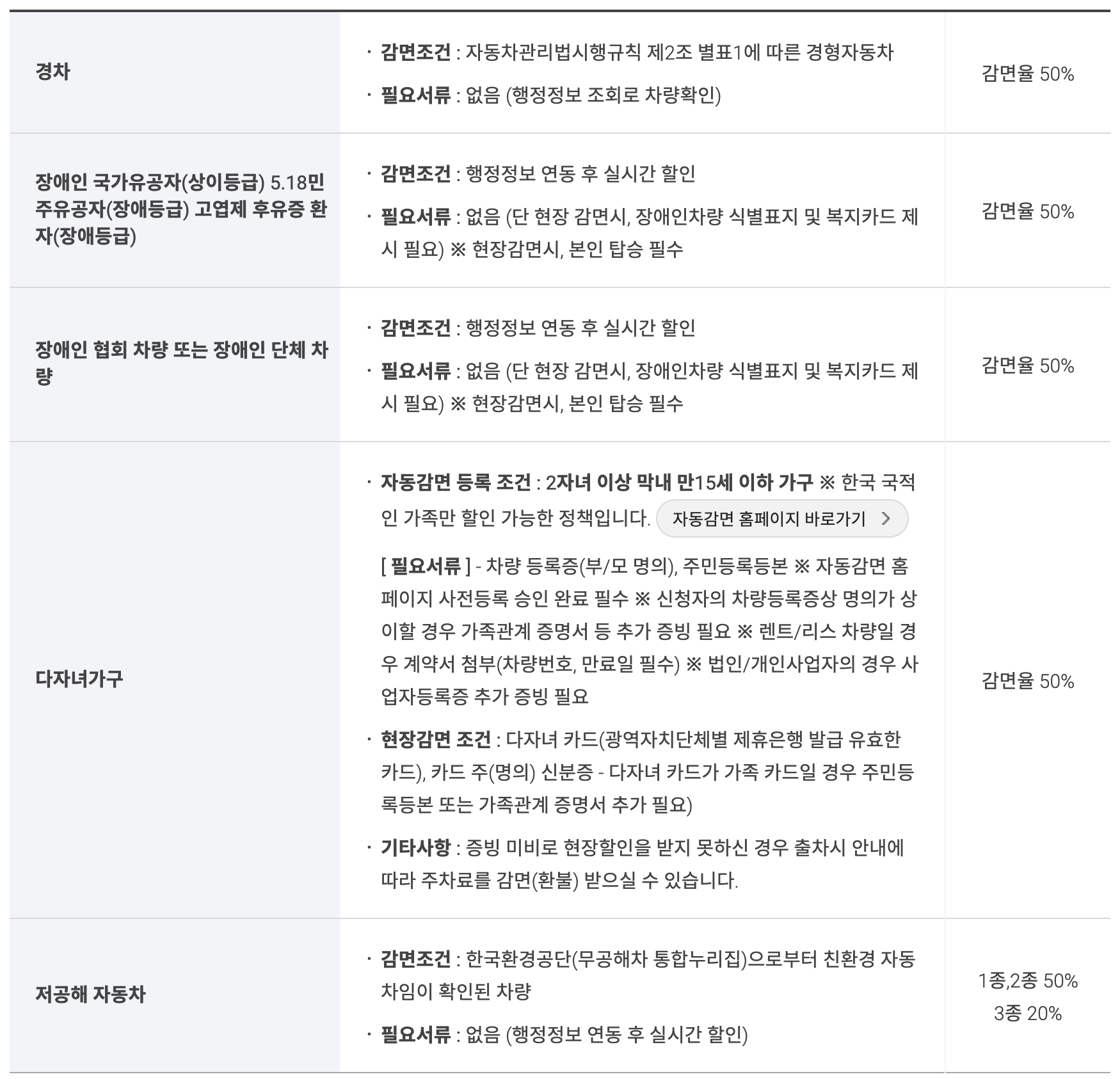 자동감면 홈페이지에 사전 등록 시 주차장에서 별도의 서류 제출 없이 할인 혜택을 받을 수 있습니다. 자동감면 사전등록을 위해서는 1️⃣ 차량등록증과 2️⃣ 주민등록등본을 제출해야 합니다.