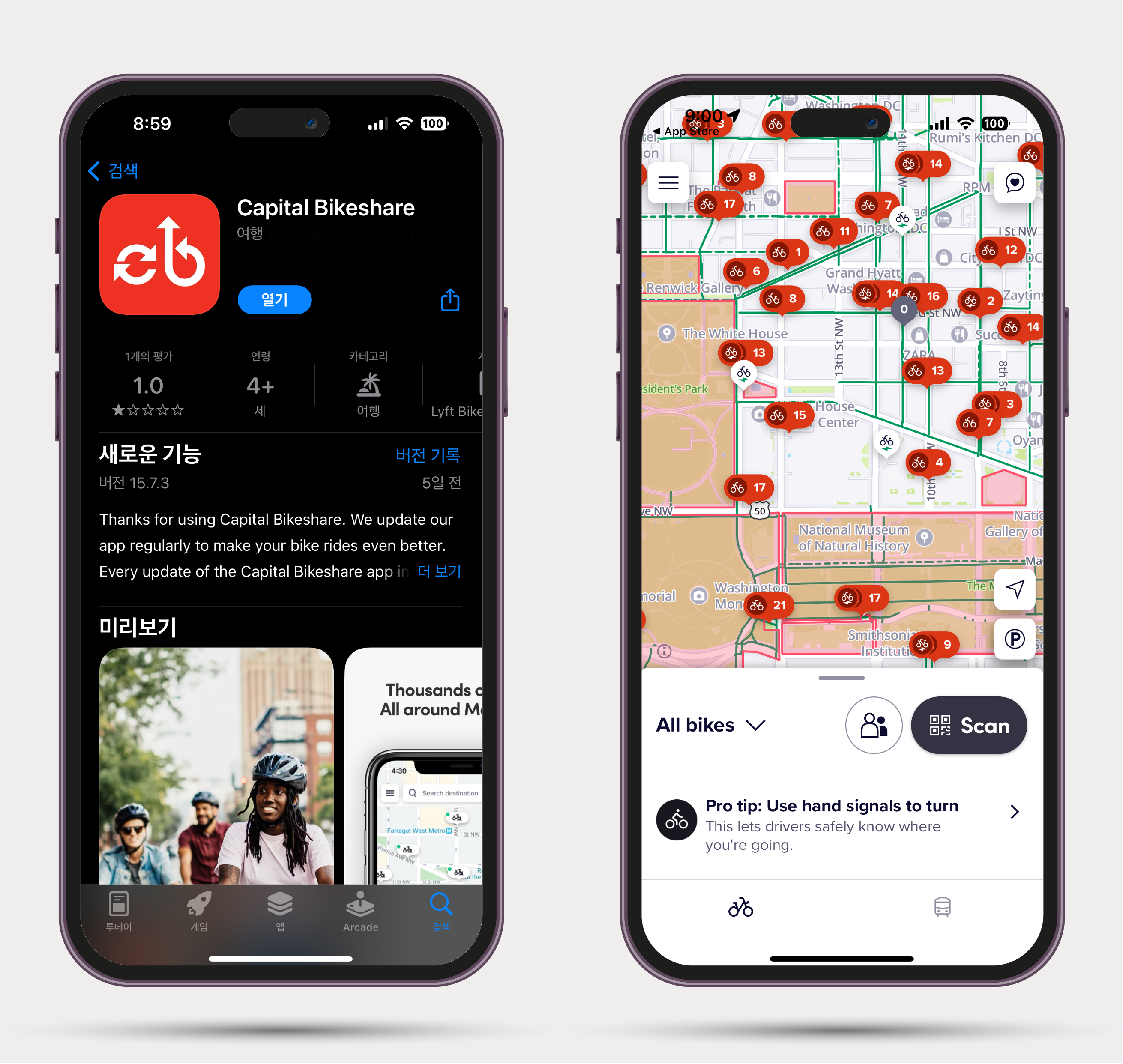 Capital Bikeshare 앱은 애플의 앱스토어와 구글의 플레이 스토어에서 다운로드하여 설치할 수 있습니다. 설치 후 회원가입을 하고 나면 내 주위에 있는 자전거들의 위치를 확인할 수 있습니다.