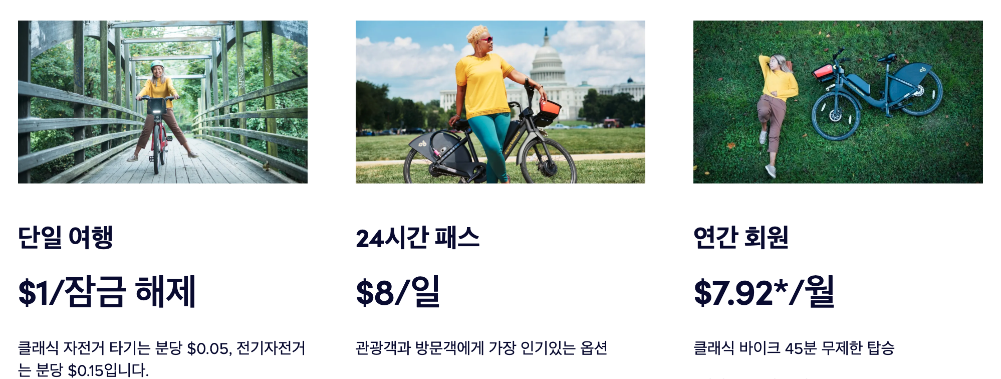 Single Trip으로 이동하는 것과 24-Hour Pass를 이용하는 것 중 어는 것이 더 유리한지 따져보고 이용하세요. 자전거를 여러 번 이용할 경우 24-Hour Pass를 구입하는 것이 유리하지만, 2~3번 이용한다면 Single Trip을 이용하는 것이 더 저렴할 수도 있습니다.