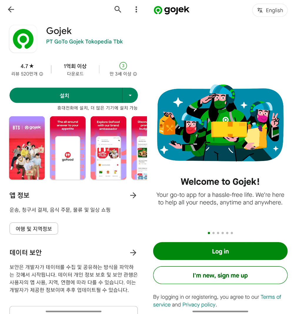 구글 플레이 스토어에서 고젝을 검색하여 설치를 합합니다. 설치 후 실행하면 'I'm new, sign me up'을 통해 회원 가입을 진행합니다.