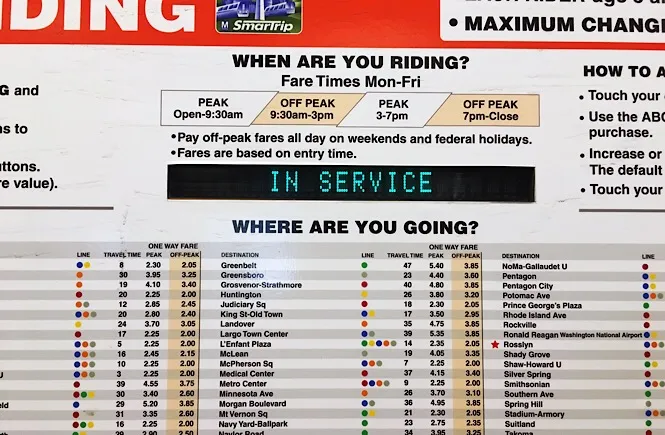 워싱턴 DC의 지하철 요금의 경우 이용하는 시간과 거리에 따라 요금이 달라집니다. 최종 목적지까지의 요금과 이용하고 자하는 시간이 피크 시간인지 아닌지를 확인하여 구입해야 합니다.