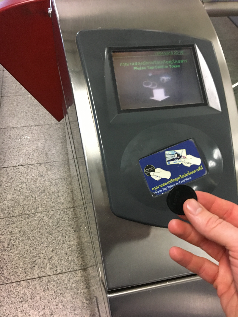 BST와 MRT의 1회 승차권의 모양은 다르지만 이용 방법은 동일합니다. MRT의 동전 형태의 토큰을 리더기에 터치한 후 게이트를 통과하면 됩니다. 그리고 목적지에 도착하면 게이트를 통화할 때 토큰 회수 주입구에 토큰을 넣고 나오면 됩니다.