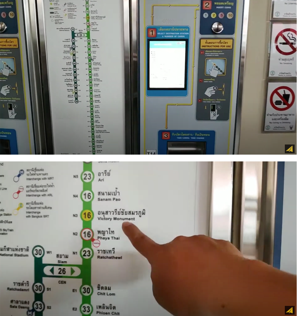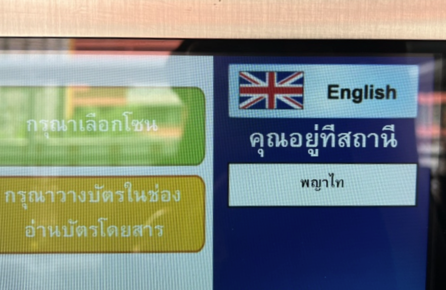 티켓 판매기는 기본적으로 태국어로 되어 있습니다. 판매기 오른쪽 상단에 있는 언어 변경 버튼을 클릭하여 언어를 영어로 변경합니다.
