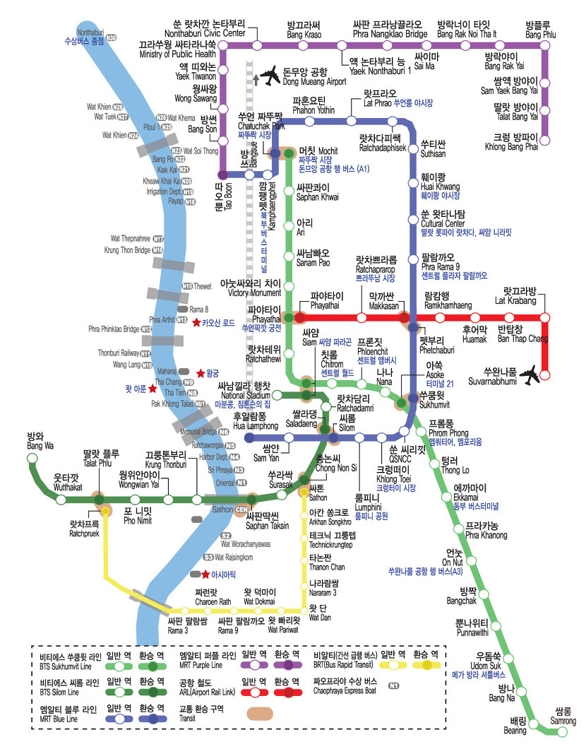 MRT 라인은 Blue Line과 Purple Line이 있습니다. 또한 방콕 수완나품 국제공항과 연결된 Airport Rail Link 라인이 있습니다. 수완나품에서 연결된 열차의 경우 급행열차와 일반 열차가 있는데 파야타이(Phayathai) 역과 연결되어 있습니다.