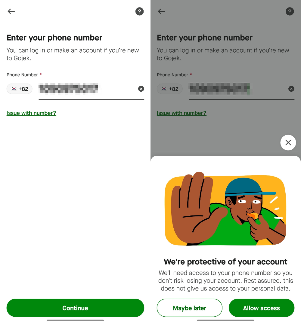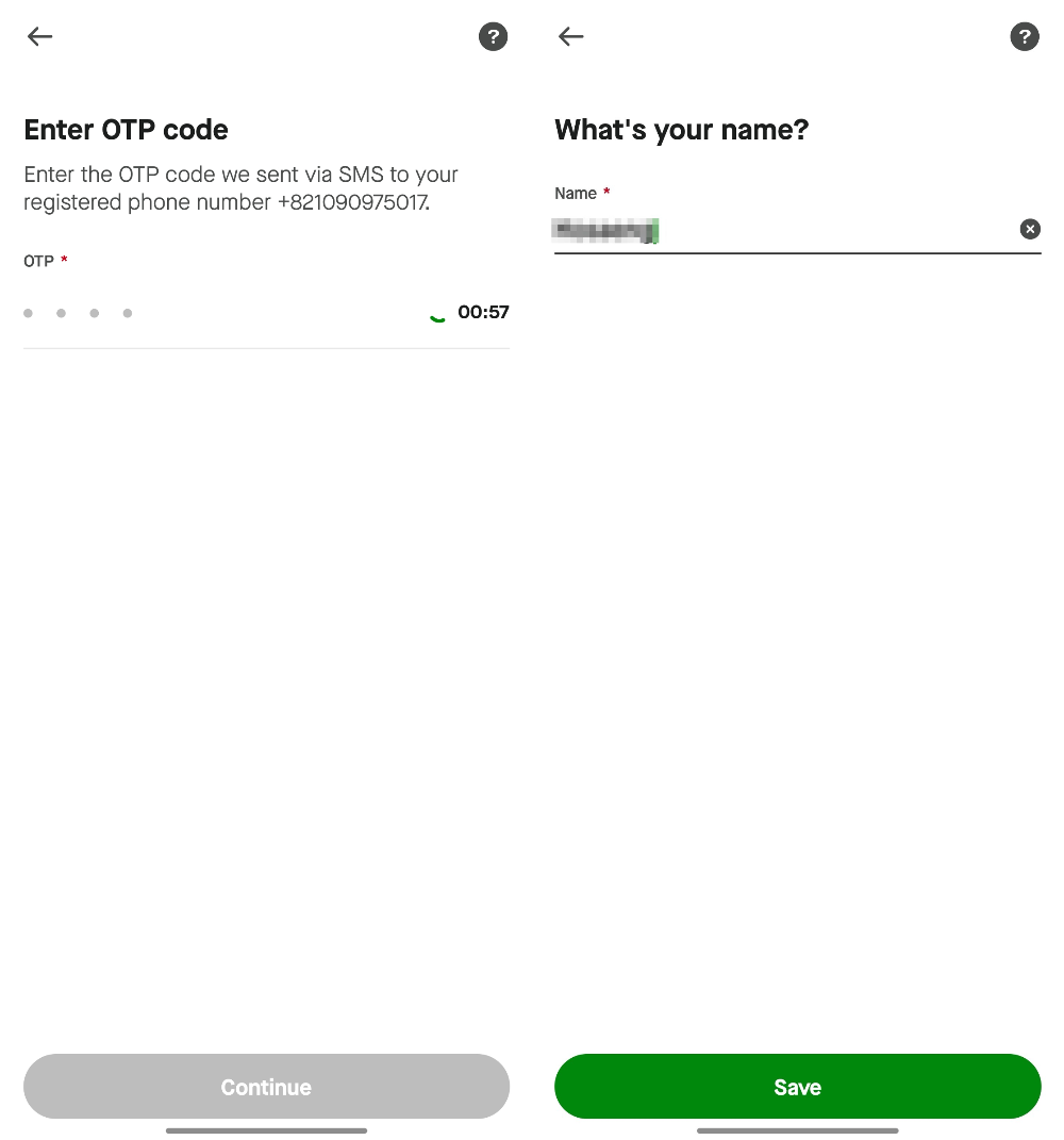 그랩앱 실행 후 'New to Grab? Sign up!'를 클릭하여 신규 가입을 진행합니다. 제일 처음 단계는 전화번호 입력입니다. 국가번호 한국 (+82) 선택 후 휴대전화 번호를 입력합니다. 첫 번째 숫자인 0을 제외하고 전화번호를 입력합니다.