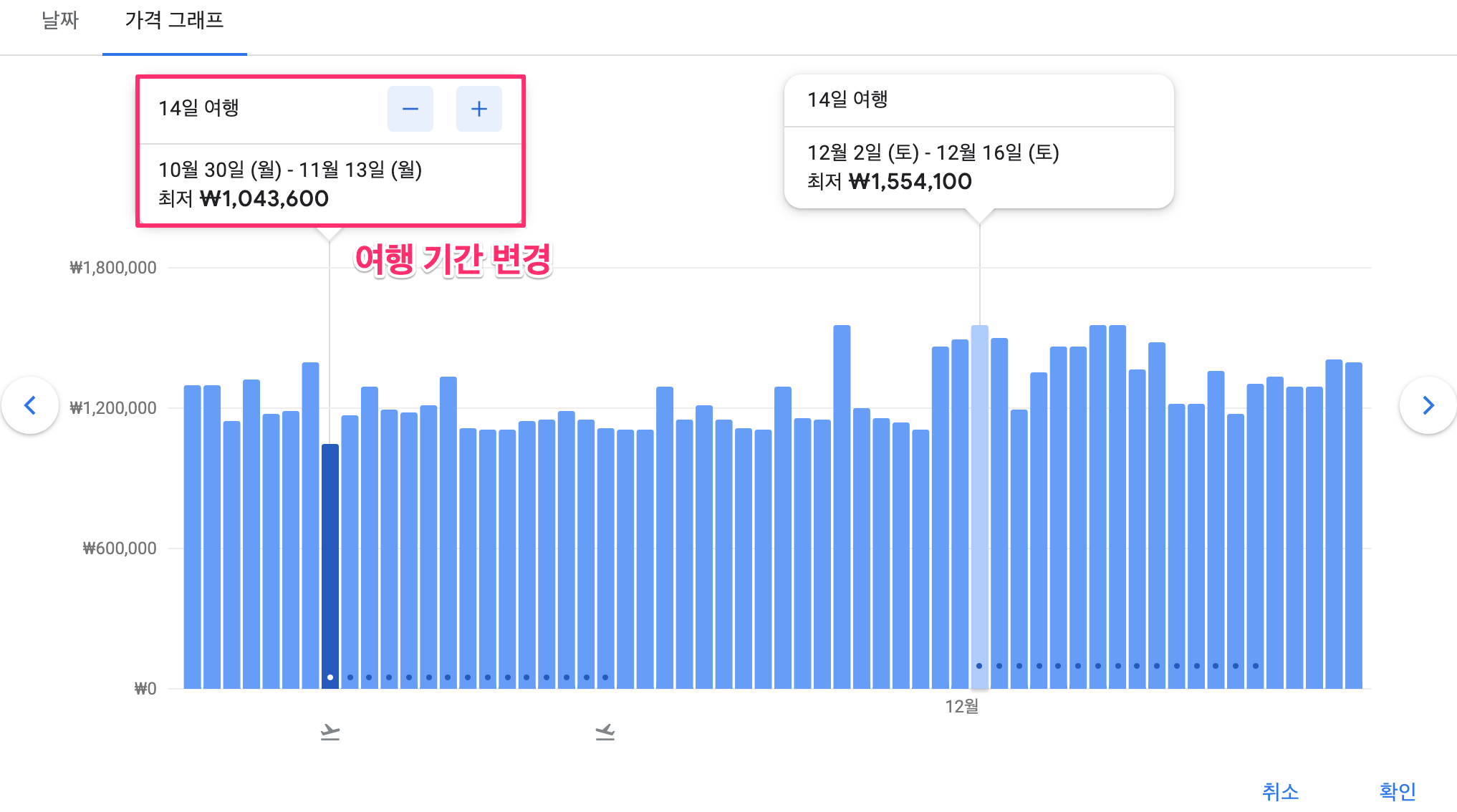 여행 기간을 변경했을 때 항공권 가격이 조금씩 변동하는지 알아볼 수 있는 방법은 2가지가 있습니다. 한 가지는 앞단락에서 설명한 가격 추적 그래프입니다. 여행 기간을 설정하고 나며 출발 일자별 최저 항공권 가격 변화를 확인할 수 있습니다. 이를 통해 다른 날짜에 여행을 했을 가격이 더 싼 지, 비싼지 알 수 있습니다. 검색 결과 화면에서 [가격 그래프]를 선택합니다.