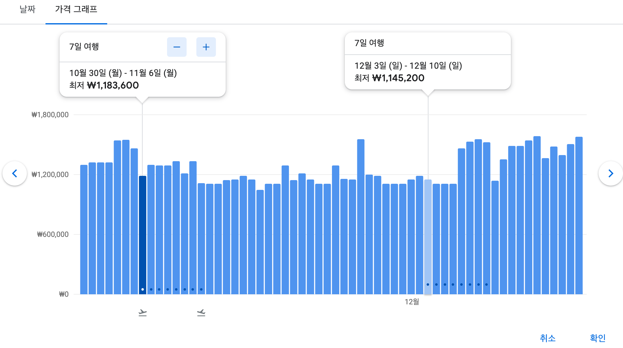가격 그래프를 클릭하면 [서울] - [로스앤젤레스] 출발 일자별 항공권 최저가 가격의 변화를 볼 수 있습니다. 앞에서 한번 설명했지만 여행 기간을 변경하면 이에 맞춰 가격이 그래프가 다시 업데이트됩니다. 아래 그래프는 7일 여행 기준으로 표시가 된 결과입니다. 처음 선택한 11월 14일(화) 출발의 경우 최저가 항공권이 약 88.4만 원임을 알 수 있고, 12월 11일(월)은 133.8만 원임을 알 수 있습니다. 가격 변동 그래프를 통해 언제 여행을 하는 것이 가장 저렴한지 예측해 볼 수 있습니다.