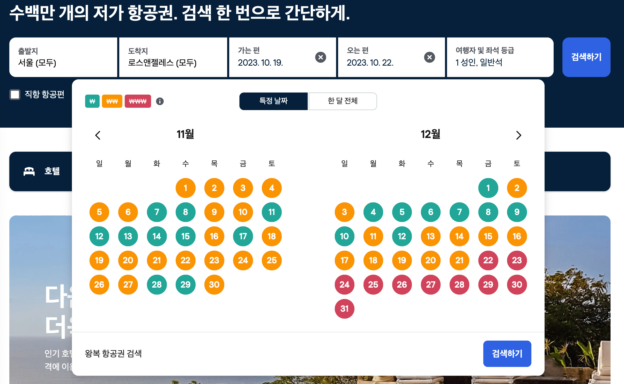 구글 항공편 검색과 비슷하게 출발 날짜와 귀국 날짜별 가격을 선택할 수 있는 화면이 나옵니다. 하지만 구글 항공편에 비해 여러 단계를 거쳐야 하는 부분이 조금 아쉽습니다.