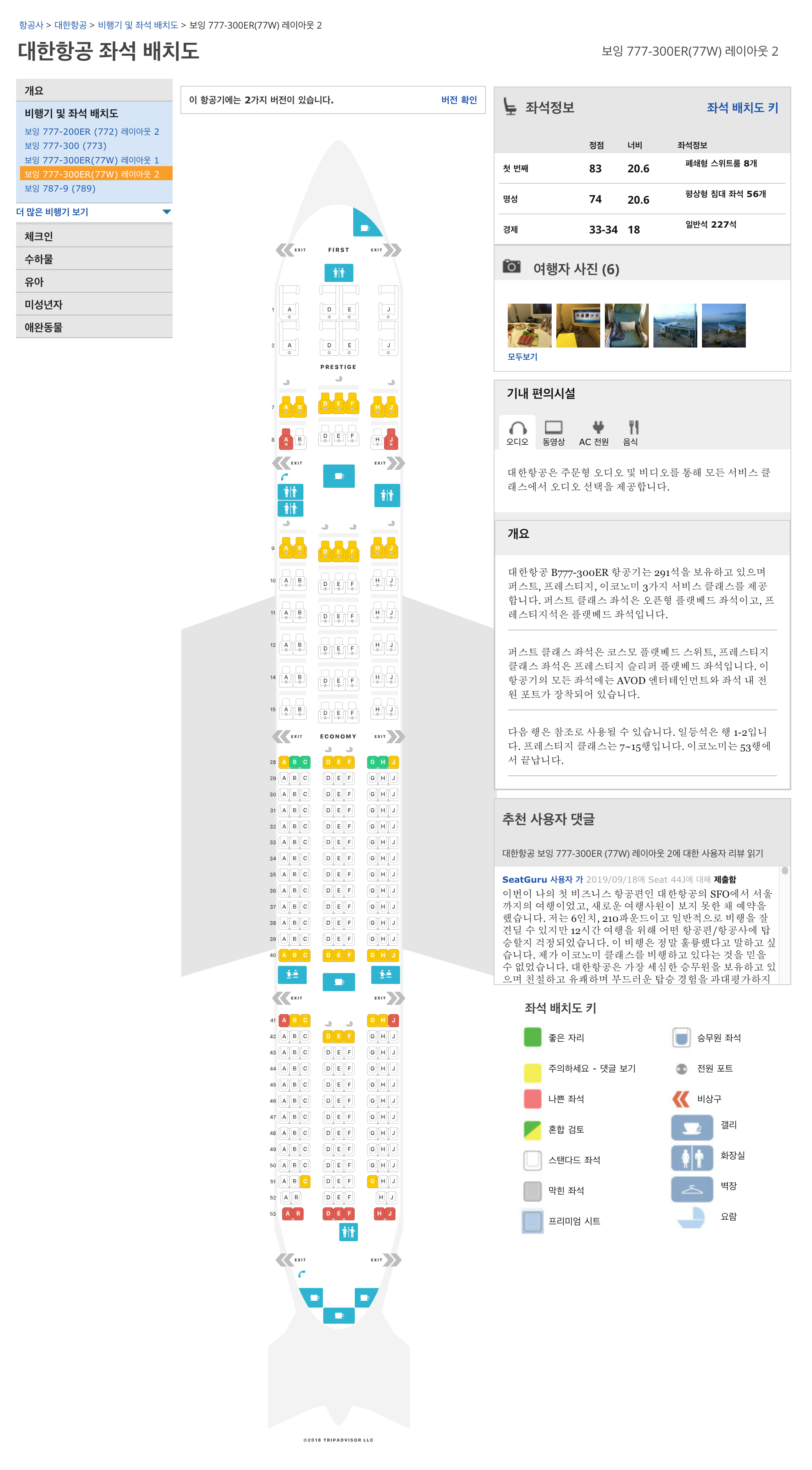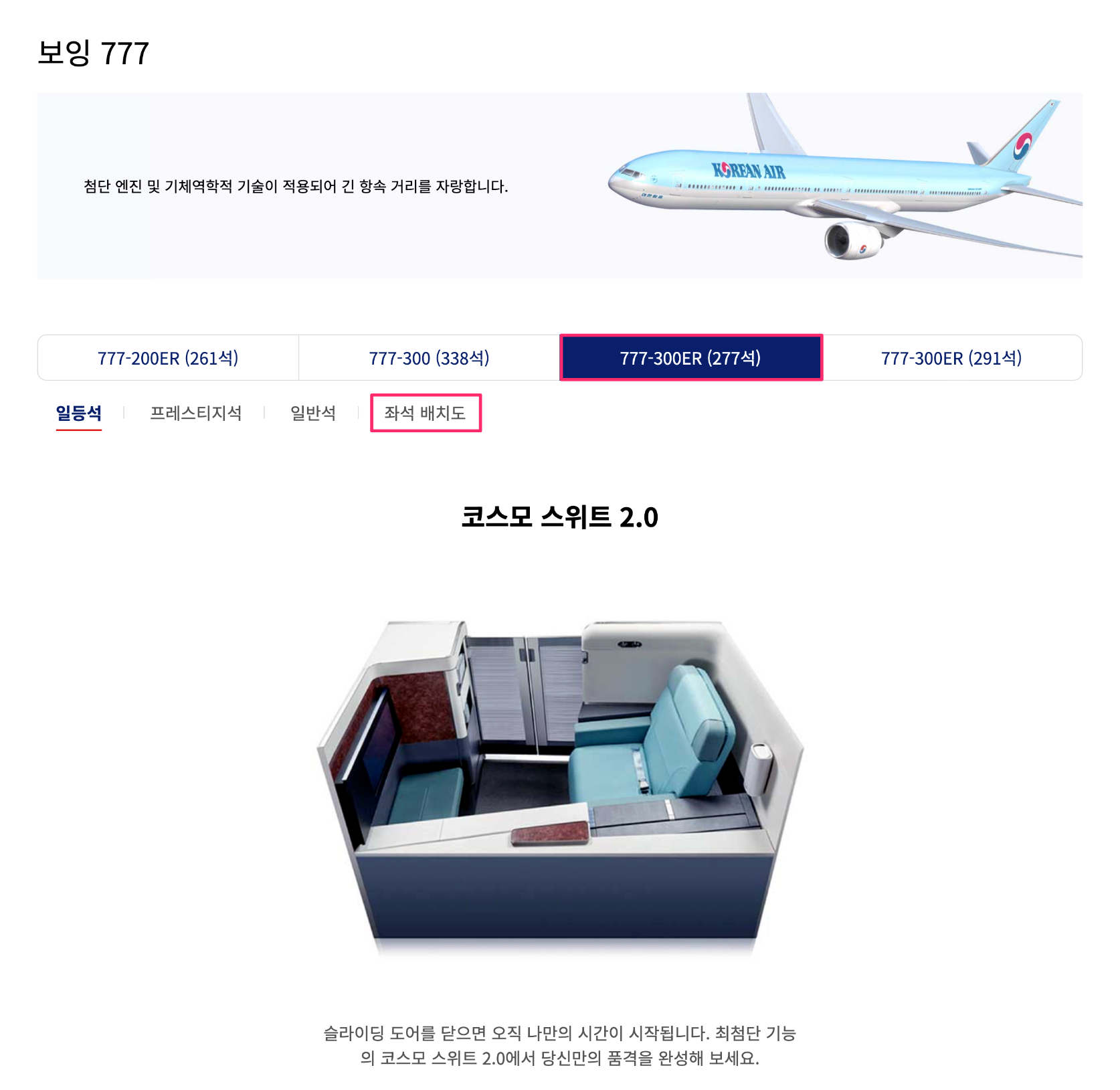 [보잉 777] 기종을 선택하며 해당 항공기 세부 모델이 다시 나타나는데 앞서 확인한 [777-300ER]을 다시 선택합니다. 그러면 각 좌석별 특징을 설명하는 페이지가 나타납니다.