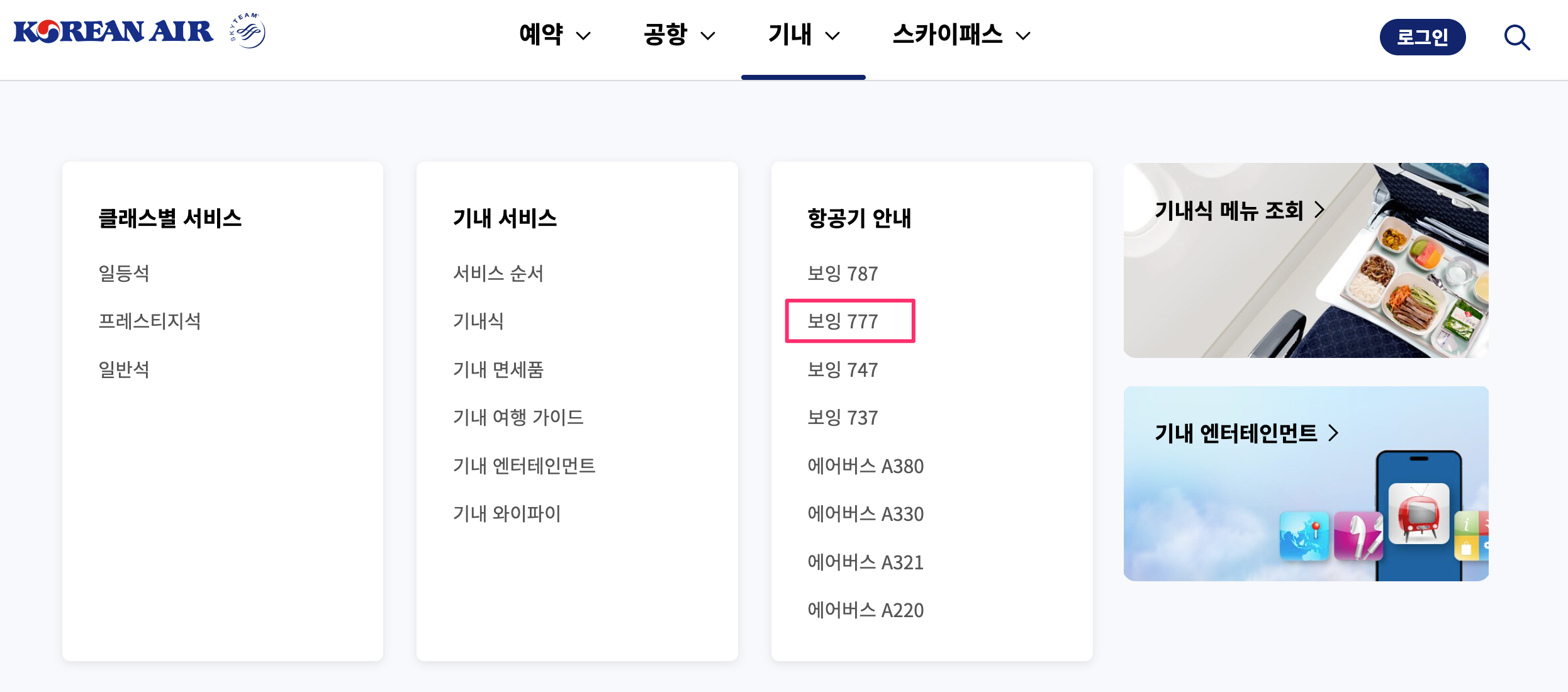시트구루 사이트를 통해 대략적으로 어떤 자리가 좋은지 그리고 어떤 자리가 나쁜지 알 수 있습니다. 하지만 해당 좌석에 대한 상세한 부분을 알 수 없습니다. 대한항공의 경우 [가상 비행기 좌석]을 확인할 수 있는 기능을 대한항공 공식 홈페이지에서 제공을 하고 있습니다. 이 부분을 확인하기 위해서는 비행기 기종을 알아야 합니다. 시트구루 사이트에서 비행기를 검색하면 어떤 항공기를 이용하는지 확인할 수 있습니다. 앞서 검색한 항공기의 경우 기종이 보잉 777-300ER임을 알 수 있습니다. 해당 정보를 가지고 대한항공 홈페이지 [기내] - [항공기 안내] - [보잉 777]을 선택합니다.