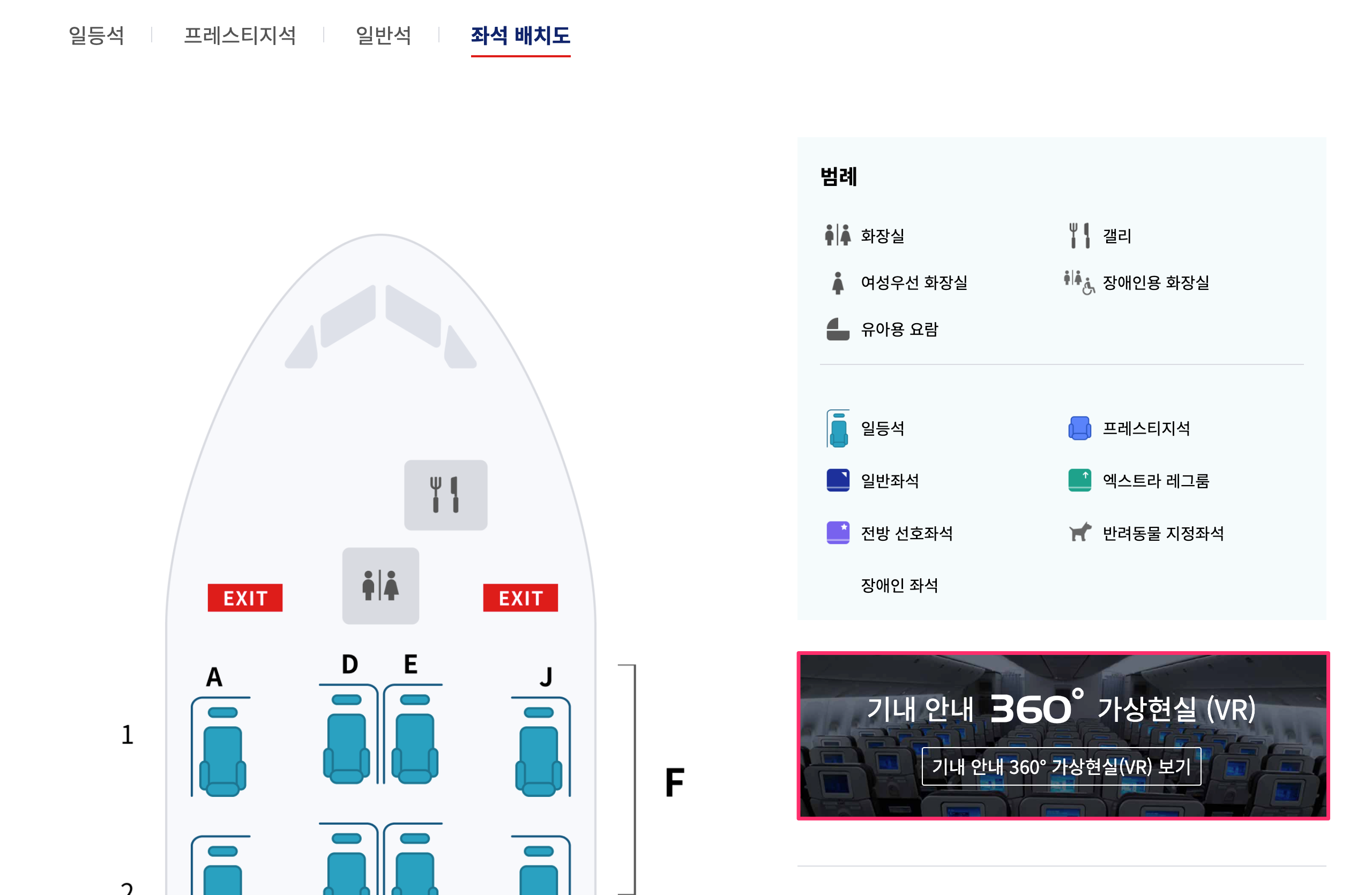 우리는 특정 좌석의 모습을 VR을 통해 확인하기 원하기 때문에 여기서 [좌석 배치도]를 클릭합니다. [좌석배치도]를 선택하면 [기내 안내 360 가상현실] 링크가 보이는데 해당 링크를 클릭합니다.