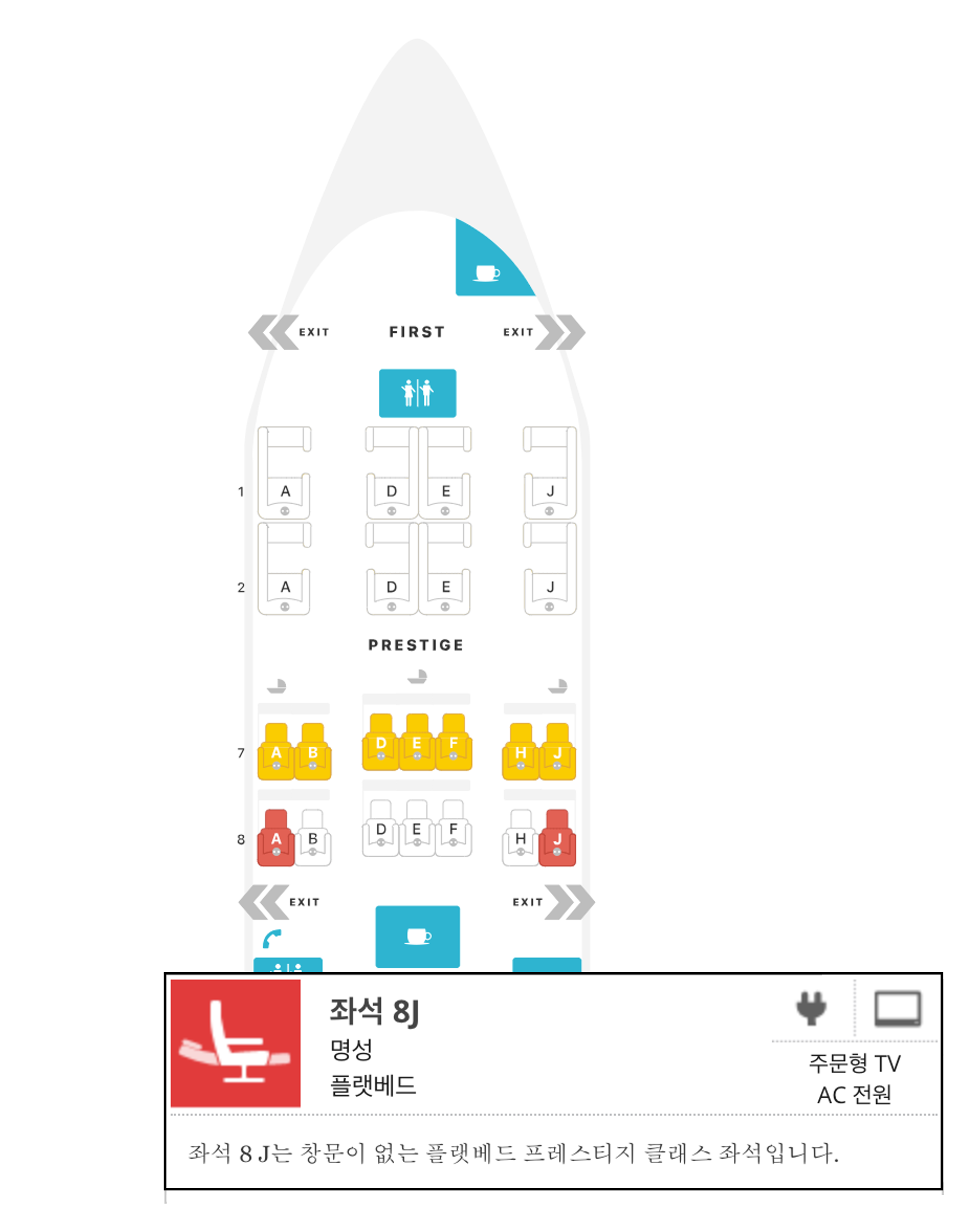 예를 들어 8J 좌석을 선택하면 해당 좌석이 왜 안 좋은 좌석인지 설명이 적혀 있습니다. 8J 좌석의 경우 창가 쪽 자리임에도 창문이 없어서 빨간색으로 표시가 되었습니다.