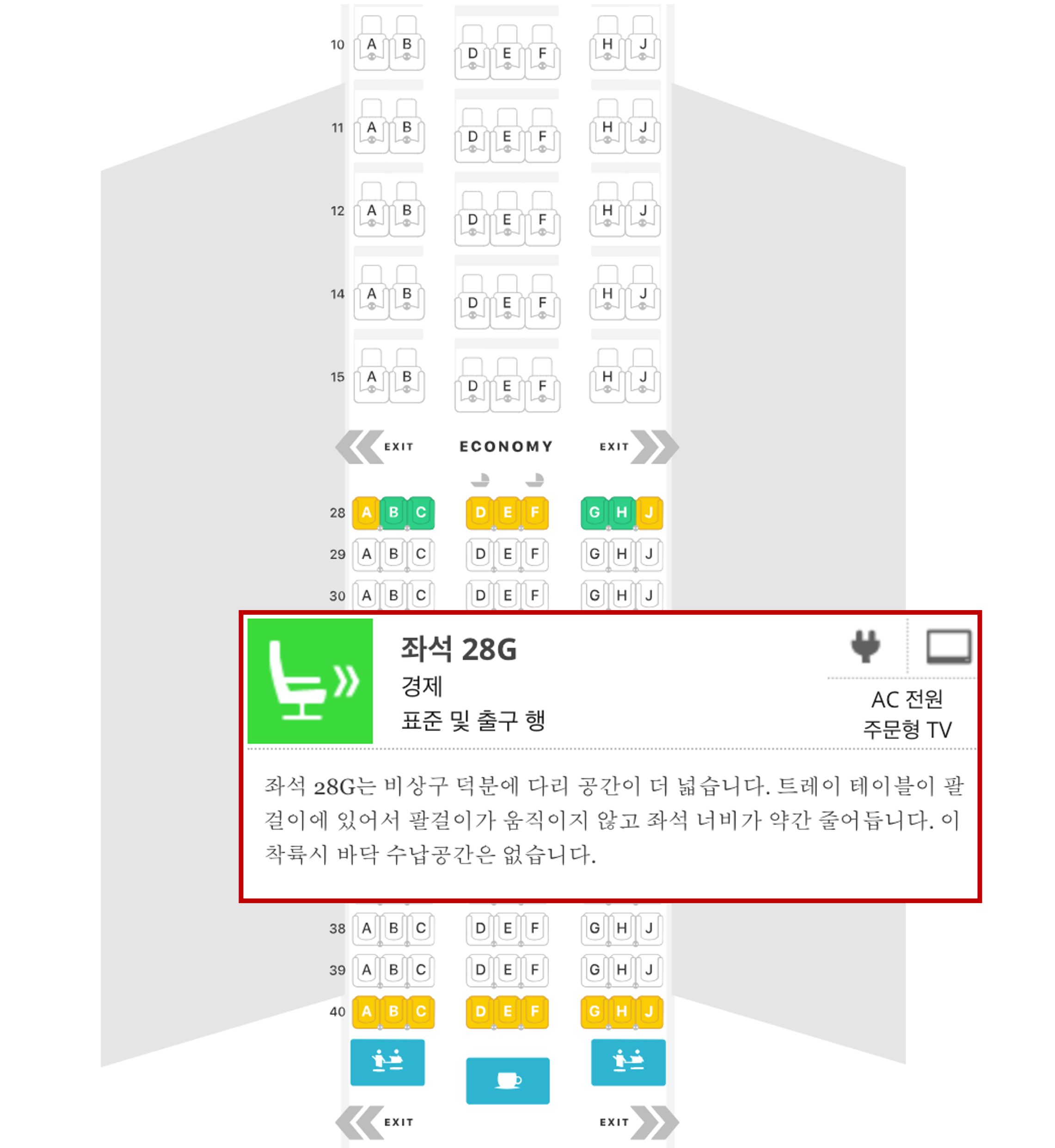 앞서 검색했던 이코노미 28G 좌석을 확인해 봅니다. 시트구루 사이트에서는 정확하게 몰랐지만 비상구 좌석 앞 공간이 매우 넓은 것을 알 수 있습니다. 이런 부분은 사진을 보지 않으면 쉽게 확인할 수 없는 부분입니다.