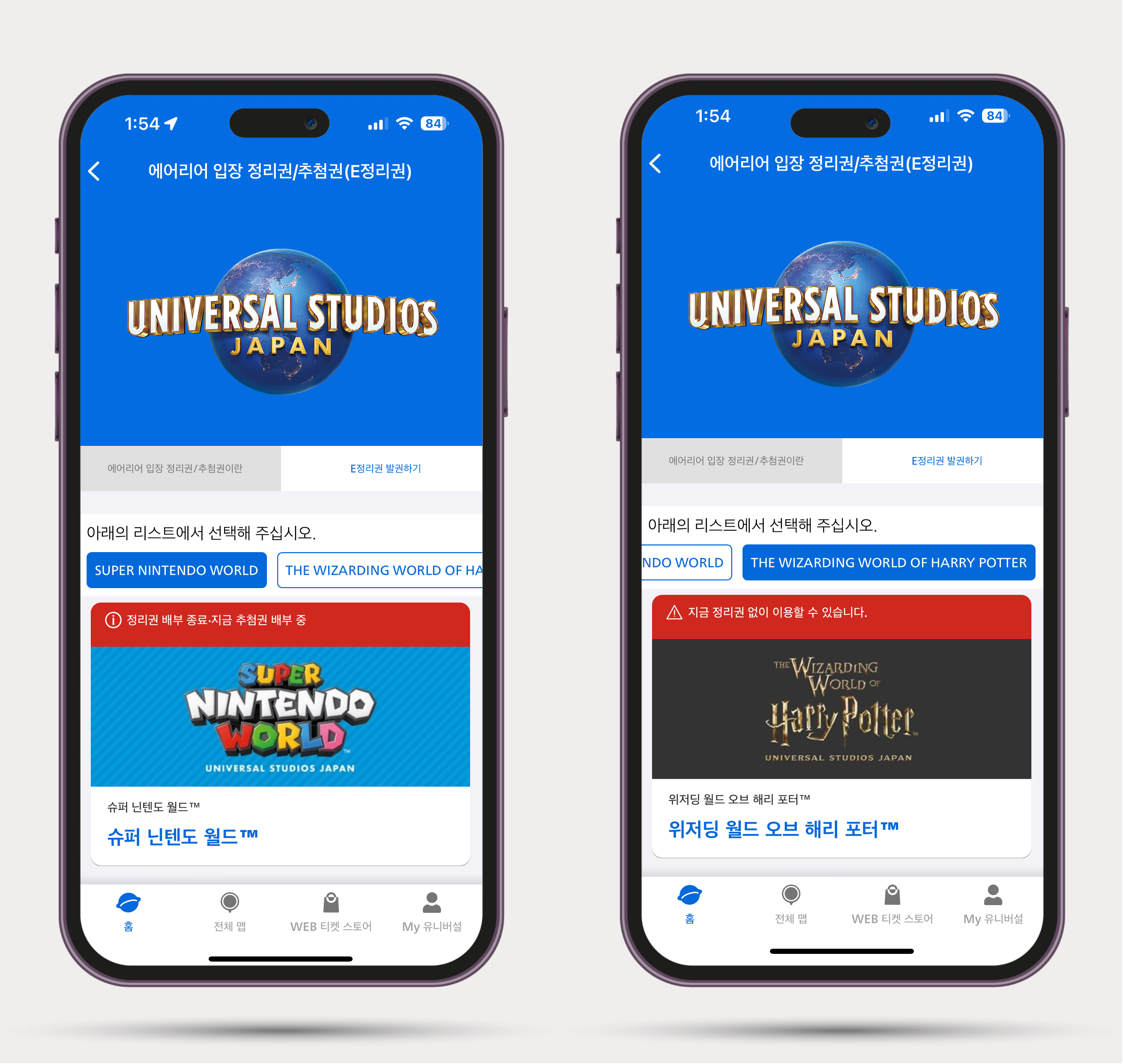 2️⃣ [E정리권 발권하기]를 클릭 후 원하는 에어리어 e-정리권을 선택합니다. 현재 에어리어 정리권의 경우 [닌텐도월드]와 [위저딩 월드 오브 해리포터] 2가지가 가능합니다.