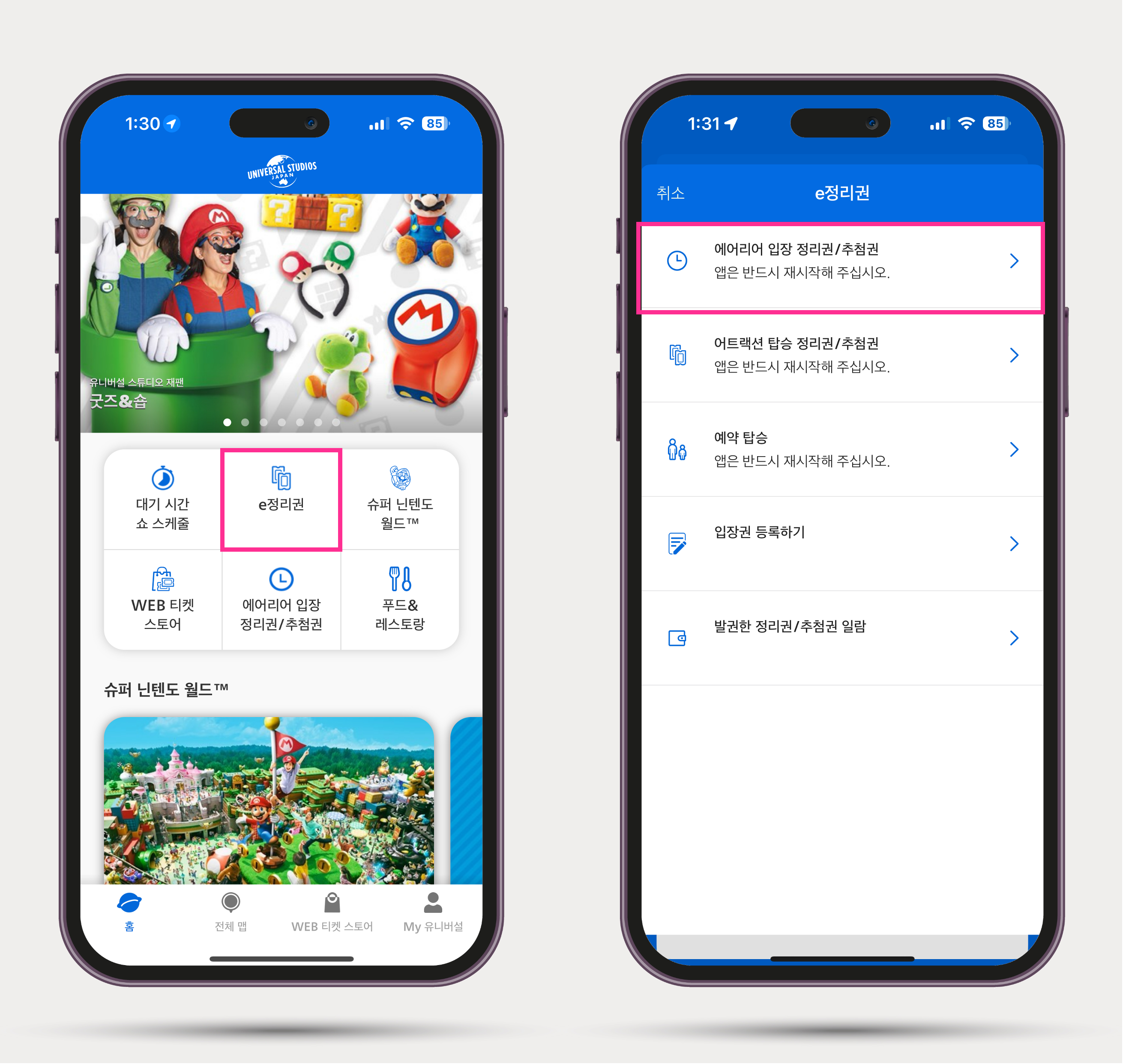1️⃣ USJ 앱에서 [e정리권] 항목 클릭 후 [에어리어 입장 정리권/추천궘]을 클릭합니다.