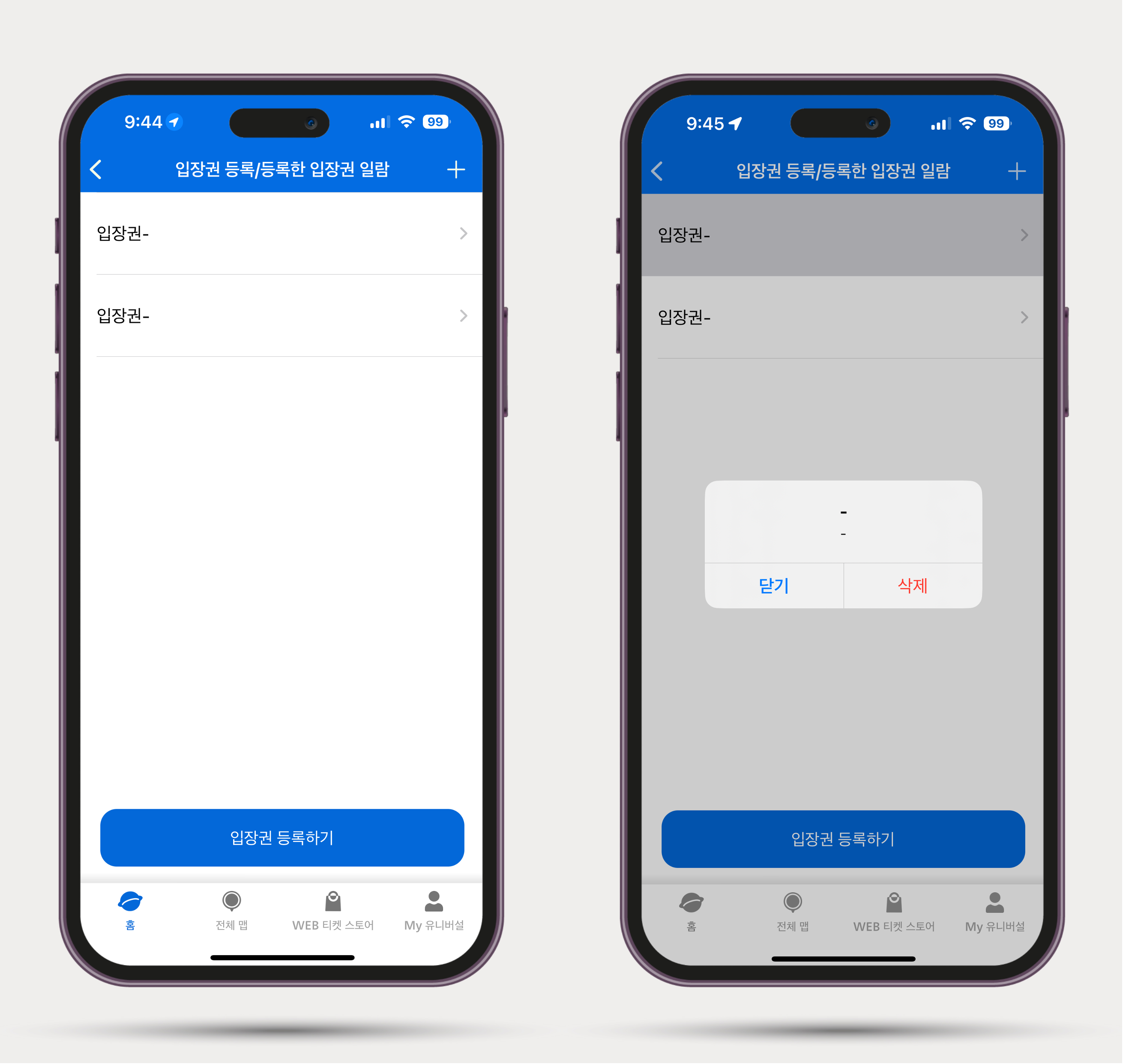 3️⃣ 입장권을 여러 장 등록하면 아래와 같이 등록 완료가 됩니다. 등록된 입장권을 클릭하면 아래 오른쪽 사진처럼 아무것도 나오지 않는데, 이 부분은 정상입니다. QR 코드를 찍오 유니버셜 스튜디오에 입장을 하면 활성화됩니다.
