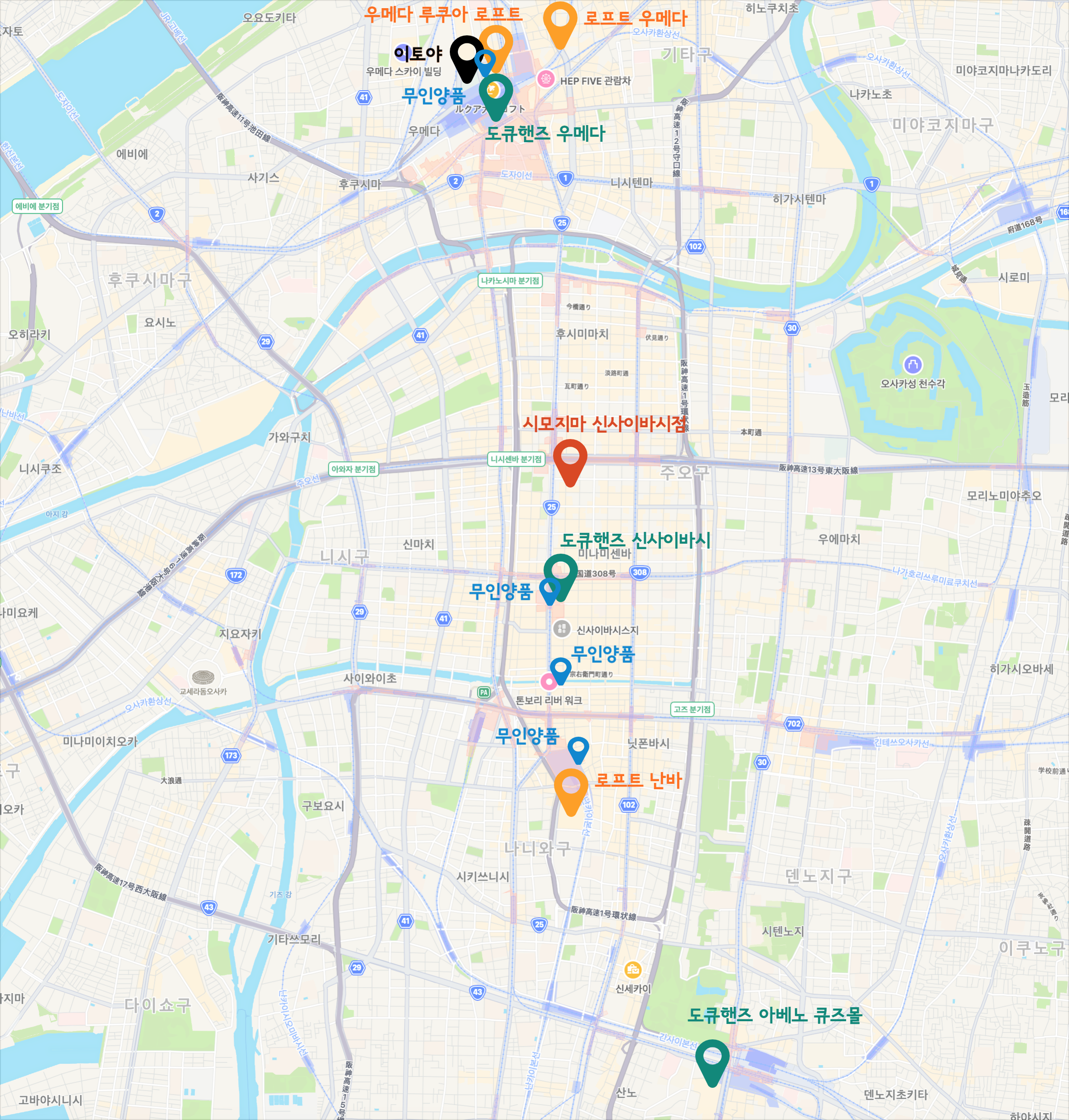 아래 지도에 문구점 위치를 정리하였습니다. 지도에서 보면 알겠지만 우메다 오사카역 주변에 대부분의 문구류 가게들이 위치하고 있습니다. 한 번에 문구점을 구경하기로 마음먹었다면 우메다 오사카역 주변에 있는 로프트 우메다, 이토야, 도큐핸즈, 무인양품점을 방문해 보기 시길 바랍니다. 문구전문점은 아니지만 우메다 요도바시 카메라 (Yodobashi-Umeda)에서도 일부 문구류를 판매합니다. 쿠루토카 다이브 샤프를 구입했다는 사람들이 있네요. 일본에서만 판매하는 다양한 전자제품을 판매하고 있어 한국인 관광객들에게도 인기가 좋은 장소입니다.