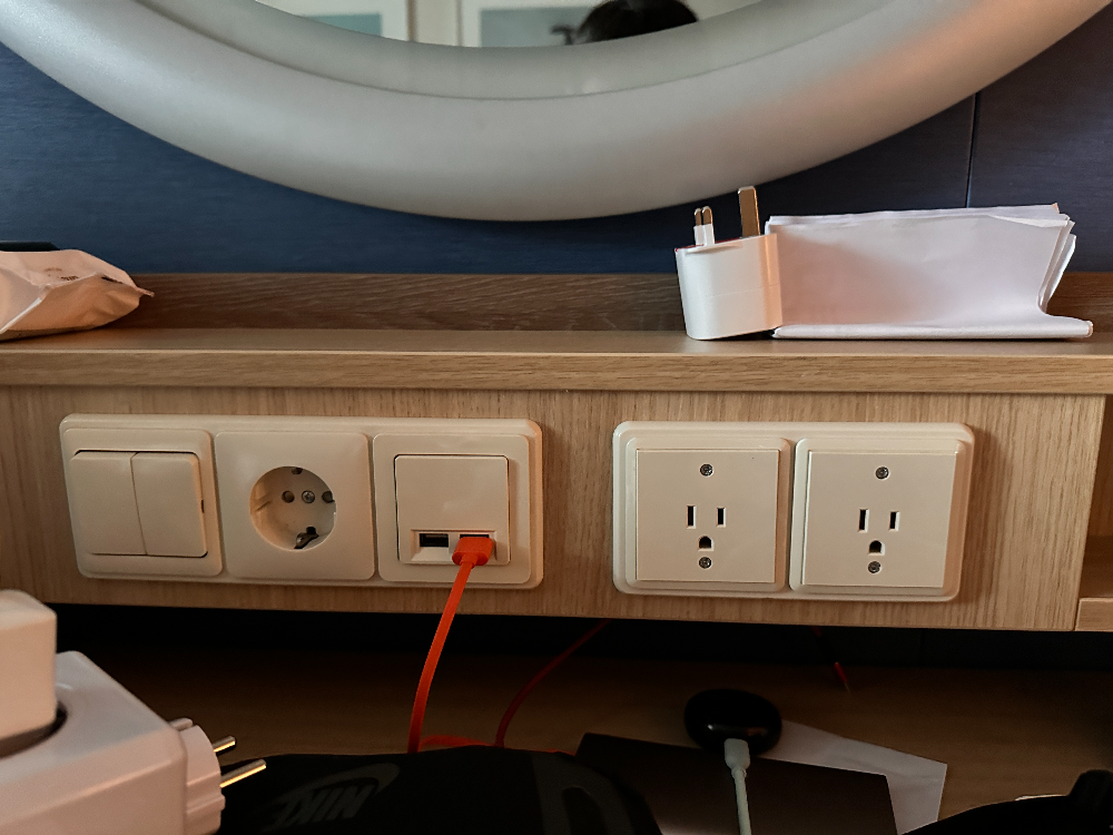 싱가포르 크루즈의 경우 싱가포르에서 출발하기 때문에 배 안에서 사용하는 콘센트가 유렵형일 거라 생각했지만 실제로는 미국형 콘센트로 되어 있었습니다. 한국형 콘센트도 책상에 1개 있어 해당 콘센트에 멀티탭을 연결하여 충전기등을 사용하였습니다.  침대 옆에 있는 콘센트도 미국형 11자형 콘세트입니다.