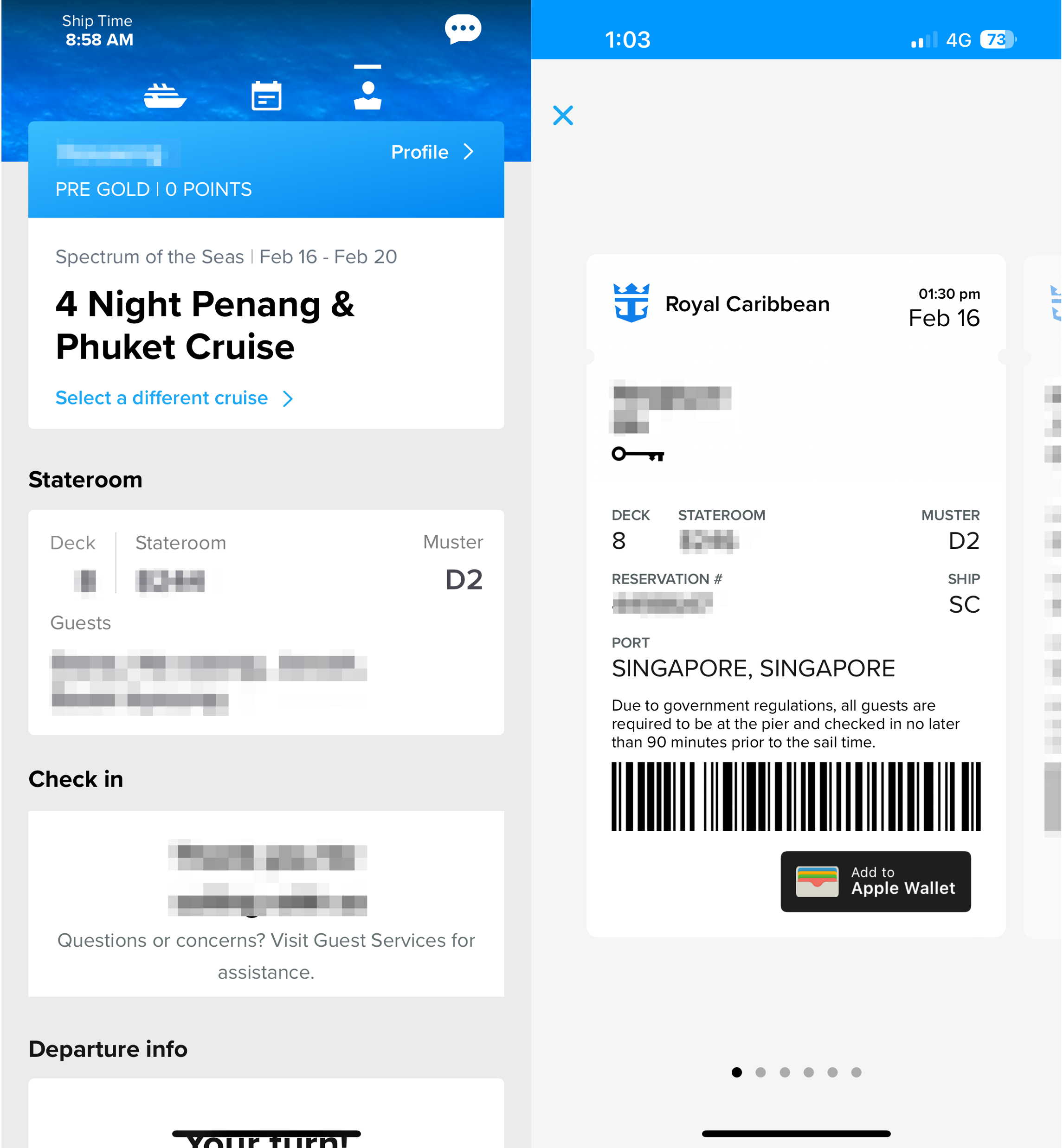 싱가포르에서 출발하는 로열 캐리비안 크루즈의 경우 승선의 경우 오전 11:30부터 시작하여 16:40 출항을 하고, 하선의 경우 오전 7:00부터 시작해서 10:00 정도까지 진행되기 때문에 이 시간을 고려해야 합니다.