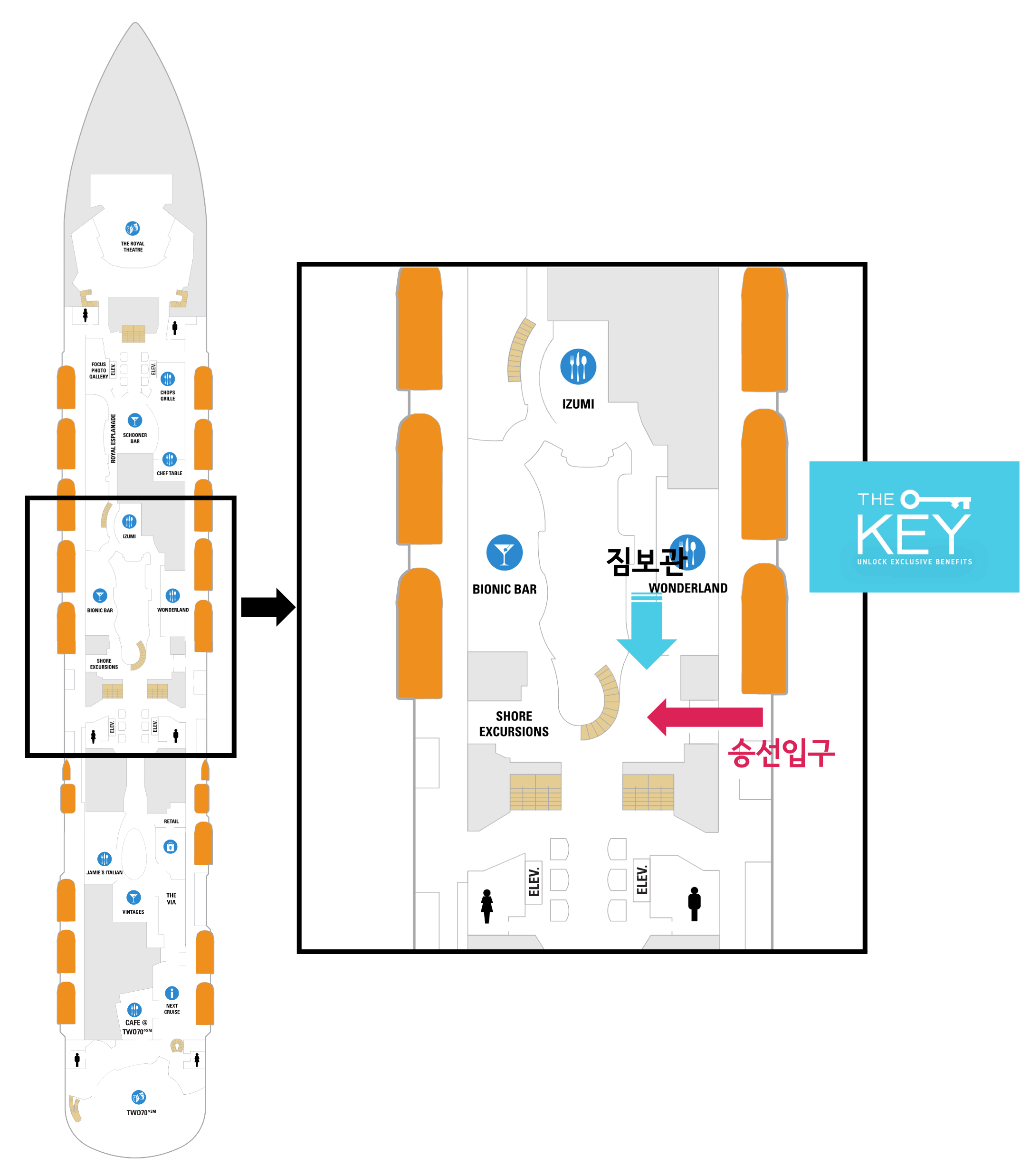 크루즈 탑승의 경우 Deck 5 (5층)으로 입장을 하게 되는데 아래 지도에 표시한 것처럼 Deck5로 입장 후 바로 오른쪽으로 보면 난간에 'The KEY'라고 터미널 밖에서 직원이 들고 있던 것과 동일한 팻말이 난간에 설치되어 있는 것을 볼 수 있습니다. 그곳에 가면 직원이 있는데 직원에게 짐을 맡기면 됩니다.