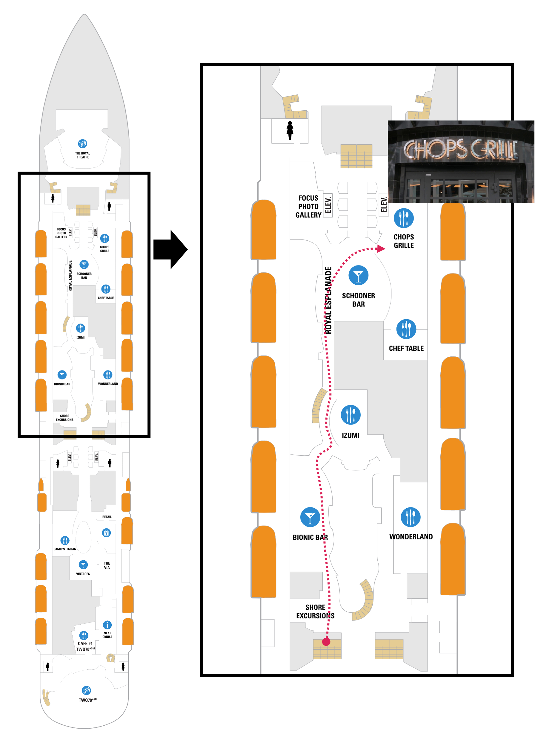 첫째 날 점심의 경우 Main Dining Room에서 Chops Grille 음식이 제공이 됩니다. Deck 5에 있는 Chops Grille 식당에서 제공이 되는 것이 아니라 Deck4에 있는 Main Dining Room에서  로얄캐리비안 앱에 있는 SeaPass에 The Key표시가 된 것을 보여주면  직원이 별로도 안내를 해줍니다. Deck3에도 Main Dining Room이 있는데 이곳에서는 전체 승객을 대상으로 뷔페 점심을 제공하고 있기 때문에 헷갈리면 안 됩니다. Deck4에 있는 Main Dining Room입니다.