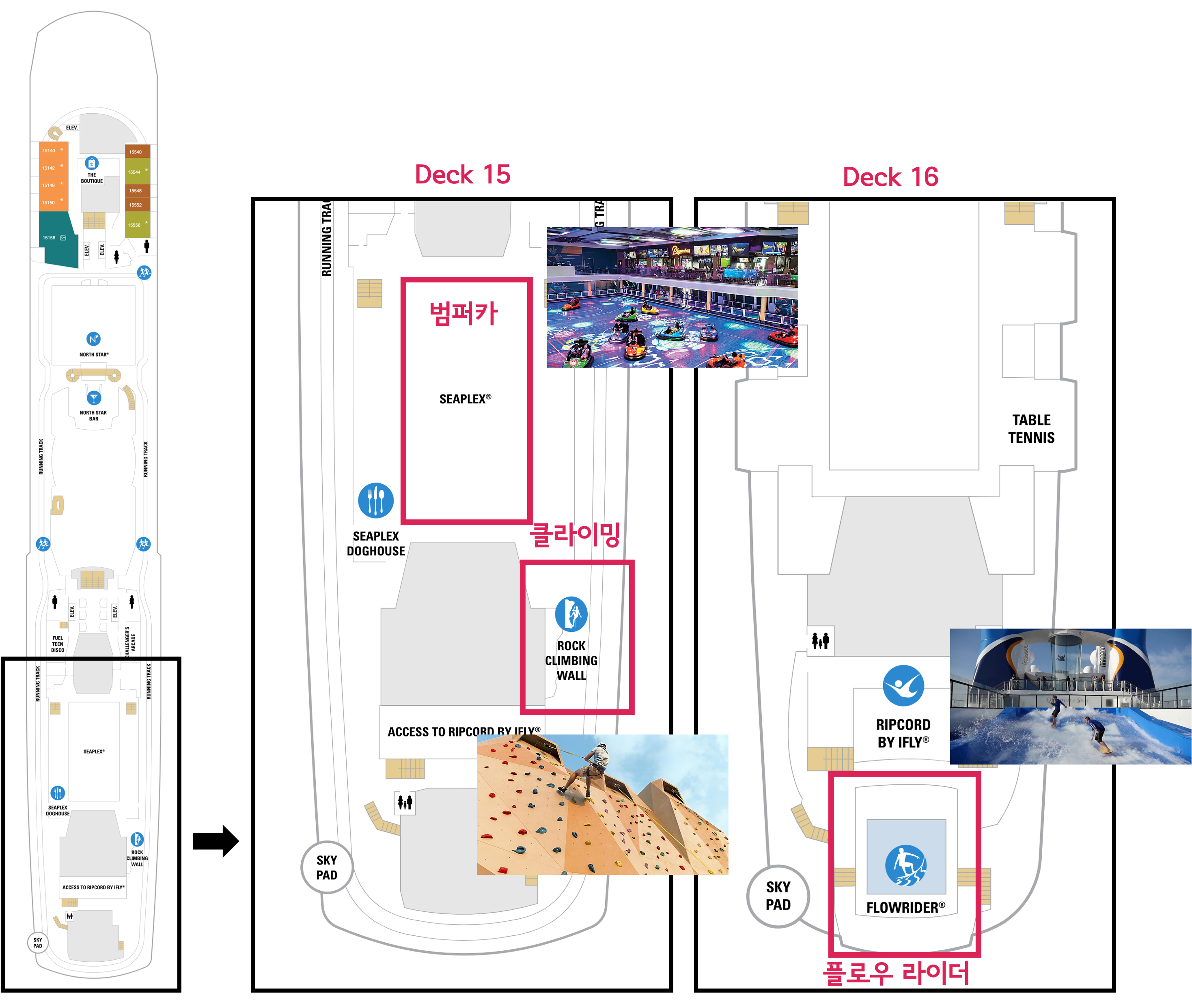 크루즈에서 이루어지는 액티비티는 대부분 Deck 15와 Deck 16에서 이루어집니다. 범퍼카, 클라이밍, 풀로우 라이더 모두 Deck 15와 Deck 16의 배 후미에 위치해 있습니다. 플로우 라이더의 경우 Deck15에서 계단으로 한층 올라가야 합니다.