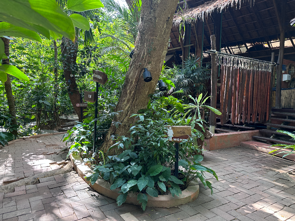 리셉션 뒤에 화장실이 있습니다. 숲 속에 위치한 화장실은 자연과 잘 어울리게 만들어져 있습니다.
