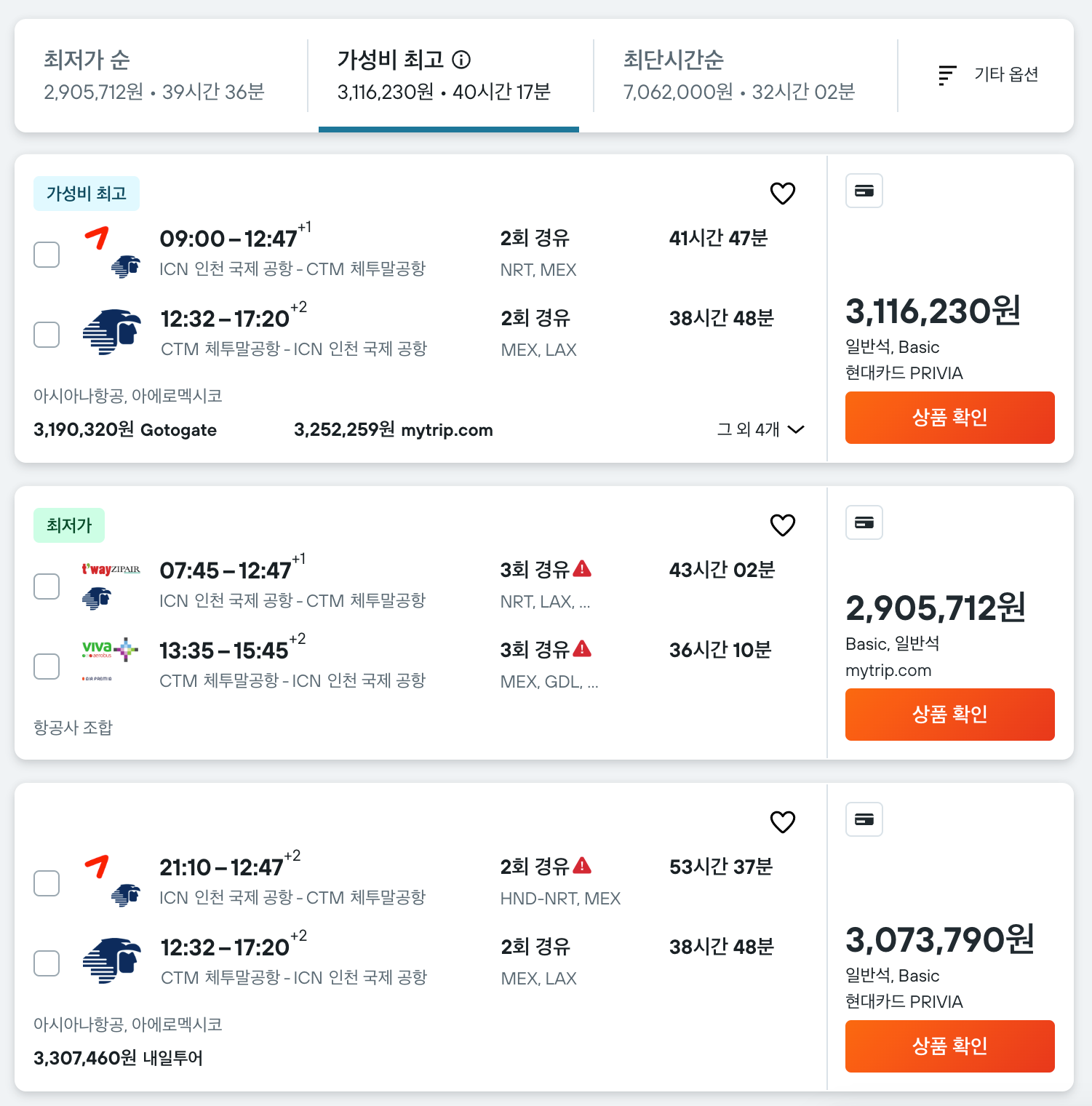 2회 경유하여 체투말 공항까지 가는 경로가 더 쌀 것 같지만 금액적으로나 시간적으로 칸쿤으로 이동 후 차로 이동하는 게 금액적으로나 시간적으로 더 저렴합니다.