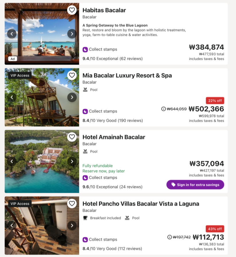 올해 여름휴가 기간인 7월 11일(화) 출발 7월 20일(목) 일 귀국하는 일정으로 검색해 보면 시간과 가격 측면에서 칸쿤으로 항공기로 이동 후 차량을 이용하여 바칼라르에 가는 것이 더 저렴하고 시간도 절약할 수 있음을 알 수 있습니다.