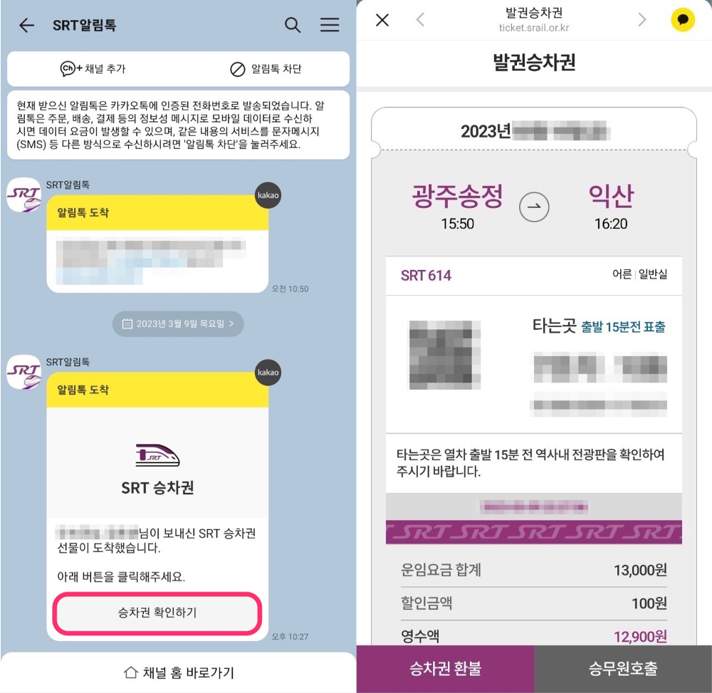 코레일 톡의 경우 구매한 승차권을 내가 카카오톡을 통해 전달을 하는데, SRT의 경우 SRT 알람톡을 통해 전달이 됩니다. 제가 부모님에게 전달한 승차권이 부모님의 카카오톡으로 전달이 됩니다. '승차권 확인하기'를 누르면 승차권을 확인할 수 있습니다.