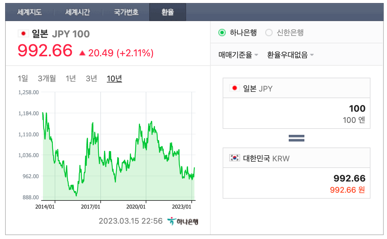 2023년 3월 15일 현재 100엔은 약 992원입니다. 지난 10년 동안의 환율 변화를 봤을 때 100엔 기준으로 900원에 1200원 사입니다. 최근 환율로 보면 100엔은 1천 원으로 생각하면 됩니다.