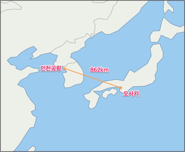 인천공항에서 오사카 칸사이 인터내셔널 공항까지 거리는 약 862km입니다. 코로나 이전에는 오사카로 운행하는 다양한 직항 항공편이 있었지만 오늘 검색해 보니 '티웨이 항공', '진에어', '피치항공' 정도가 운행하고 있습니다.