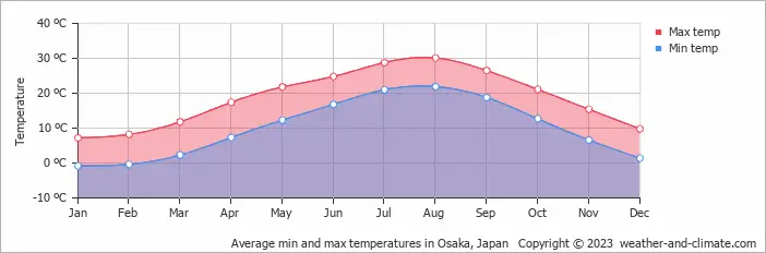 오사카는 사계절인 있는 아열대 기후 특성을 가지고 있습니다. 겨울철 낮 온도는 약 10도 정도 되면 밤에는 영하까지 내려갑니다. 여름의 경우 8월이 가장 더운데 낮 기온 평균이 약 30도 정도 됩니다. 또한 바다와 인접해 있어 습도도 내무 높습니다.