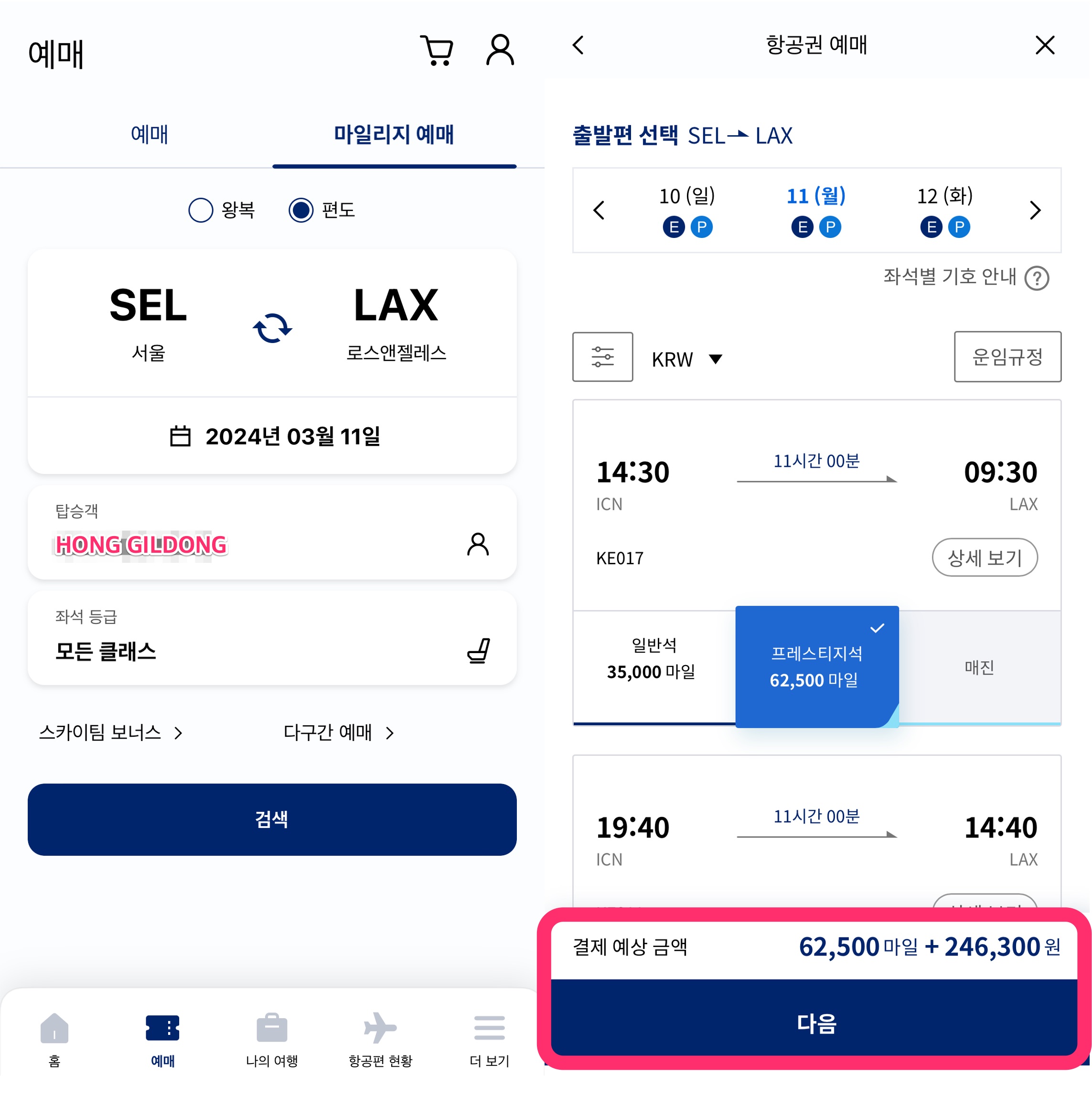 인천출발 로스앤젤레스 도착하는 프레스티지 항공권을 선택하면 63,500마일에 246,300원이 필요한 것을 알 수 있습니다. 원하는 항공권을 선택 후 결제 예상 금액 확인 후 다음 버튼을 누르면 탑승객 확인 및 결제 화면으로 이동합니다.