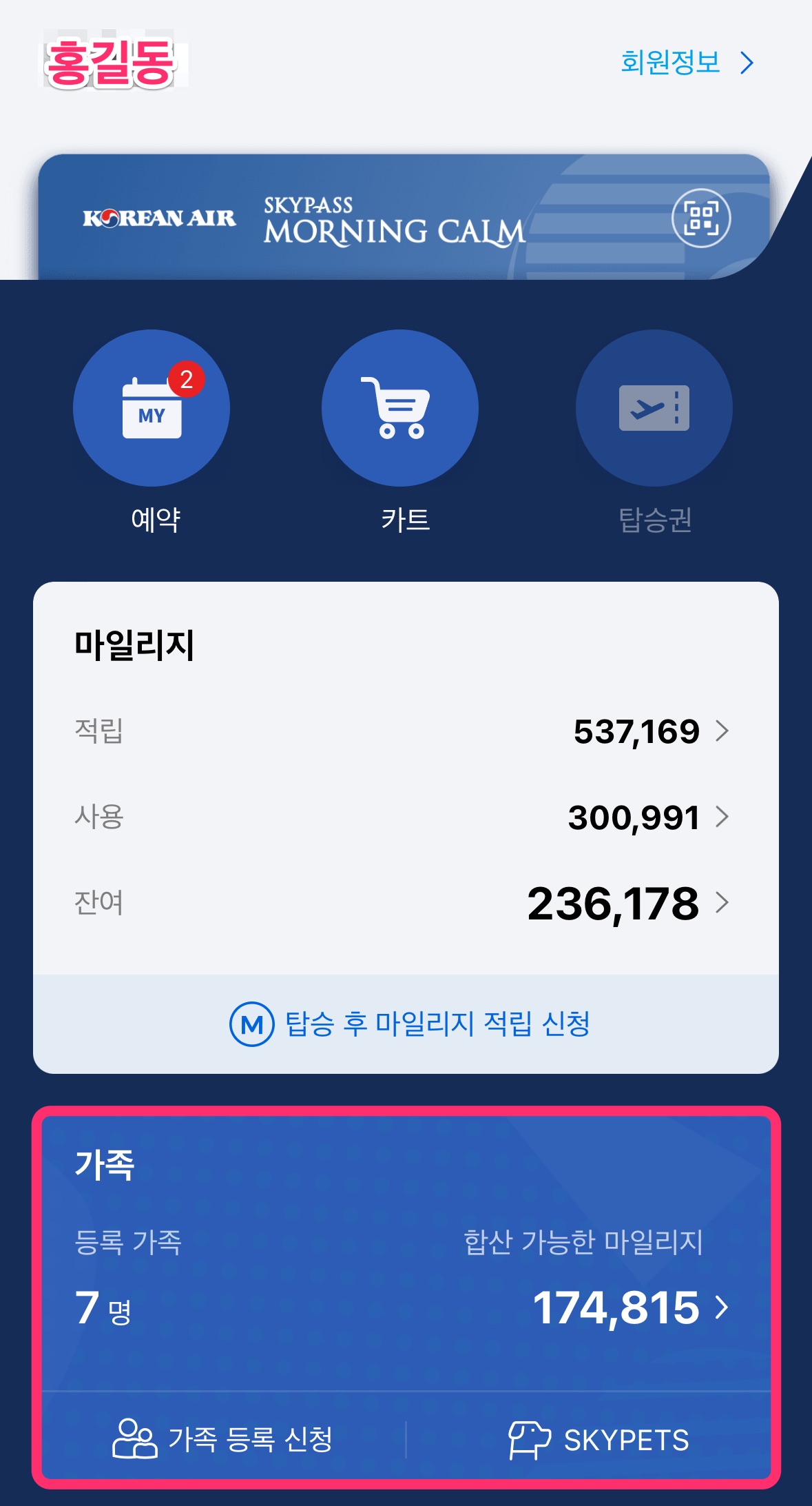 대한항공 홈페이지 또는 대항항공 앱을 이용하면 내가 적립한 대한항공 마일리지 현황을 확인할 수 있습니다. 만약 가족 합산을 미리 신청한 경우 신청한 가족들의 마일리지 합산 현황까지 확인할 수 있습니다. 아래 사진을 보면 사전에 등록한 7명의 가족들이 17만 마일을 보유하고 있는 것을 볼 수 있습니다.