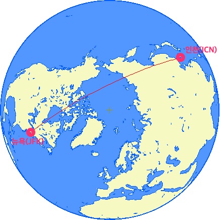 우리나라 인천에서 뉴욕 JFK 공항까지 거리는 약 11,000km로 비행기로 약 14시간이 소요됩니다.  인천에서 뉴욕의 비행경로의 경우 북극 근처로 해서 지나가게 됩니다. 우리가 일반적으로 보는 지도에서는 어떻게 가는지 잘 알기 힘든데, 지구본 형태의 지도를 보면 최단 거리로 가고 있는 것을 알 수 있습니다.