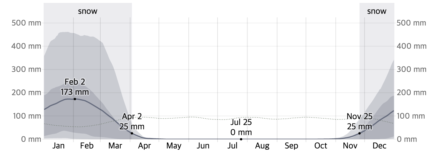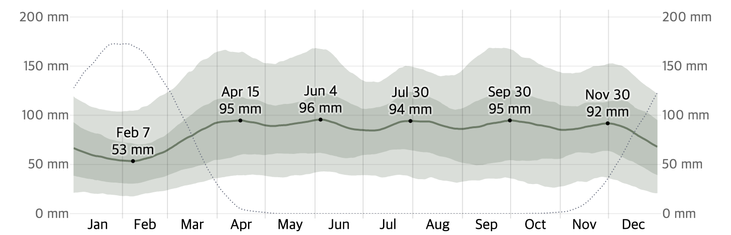 뉴욕의 강수량의 경우 동남아시와 같이 건기와 우기가 따로 있지 않고 일 년 평균으로 보면 95mm 정도로 일정합니다. 반면에 겨울철의 경우 눈이 많이 내립니다. 눈 폭설로 인해 시 전체가 마비되는 경우가 자주 발생합니다.