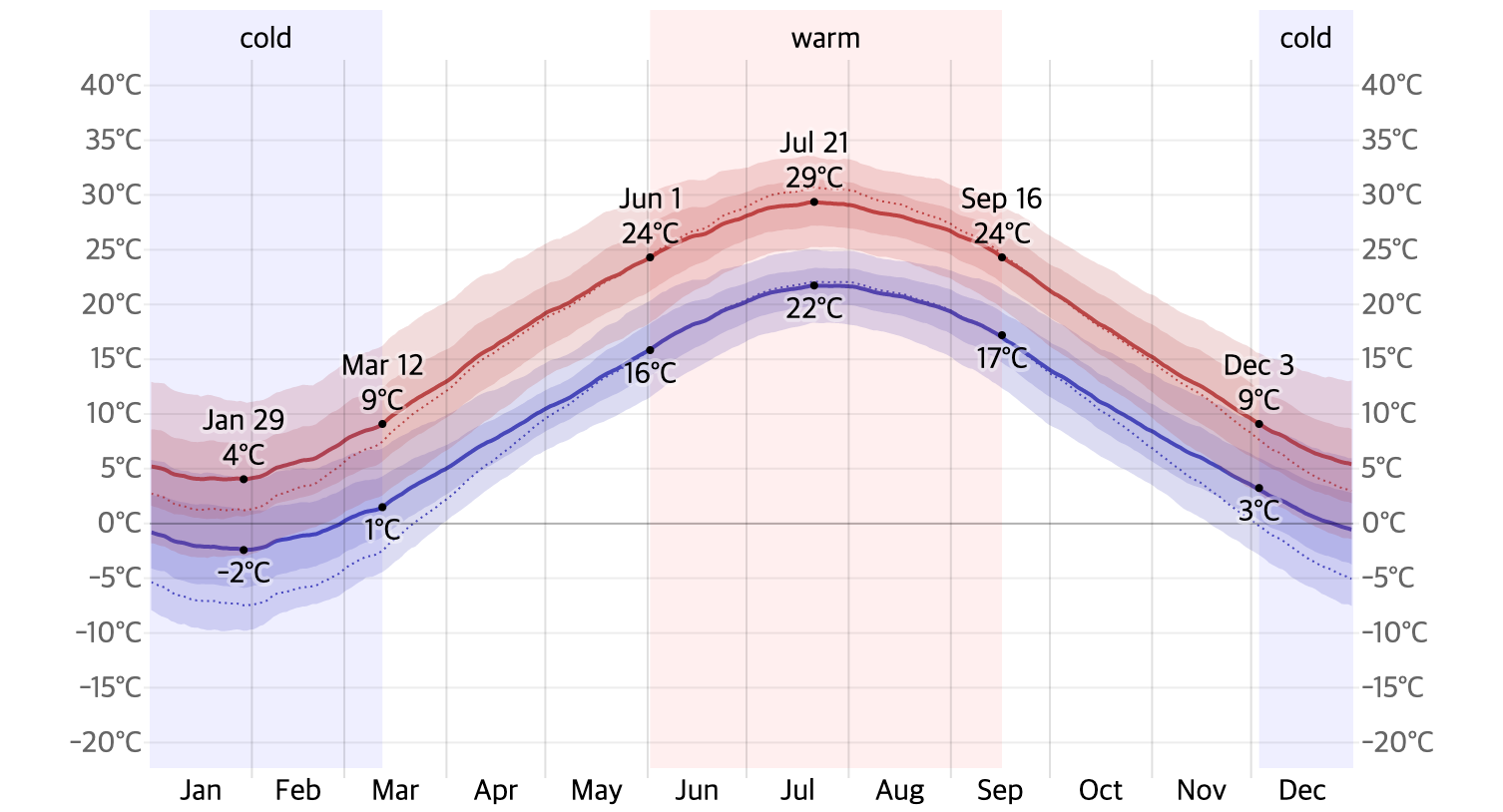 여름철의 경우 많은 사람들이 뉴욕을 방문하지만 더위를 견뎌야 합니다. 7월과 8월의 경우 평균 기온이 30도 이상으로 매우 덥습니다.