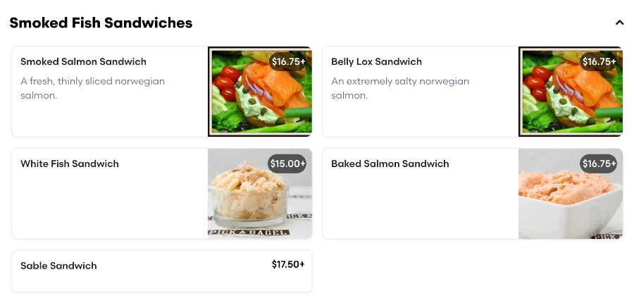 한국 사람들의 경우 연어가 들어간 메뉴를 좋아하는데 "Smoked Fish & Appetizing" 항목에 있는 'Baked Salmon Salad'와 'Nova Scotia Salmon' 메뉴가 있습니다.