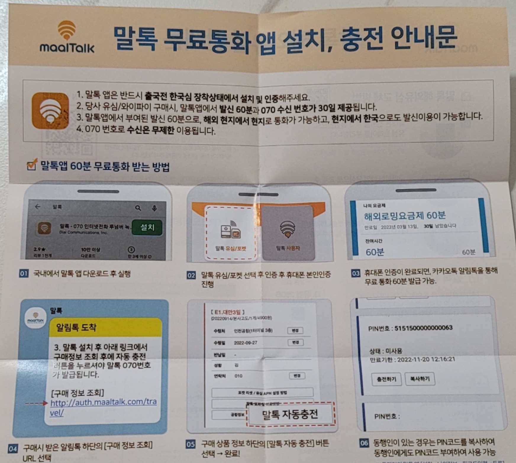 카카오톡으로부터 받은 알림톡에서 '구매정보 조회' 후 '자동 충전' 버튼을 누르면 070 번호가 발급이 되면서 무료로 사용할 수 있게 됩니다. 만약 복수개를 구입하여 사용할 경우 같이 가는 사람이나 가족에서 PIN 코드를 부여하여 사용하면 됩니다.