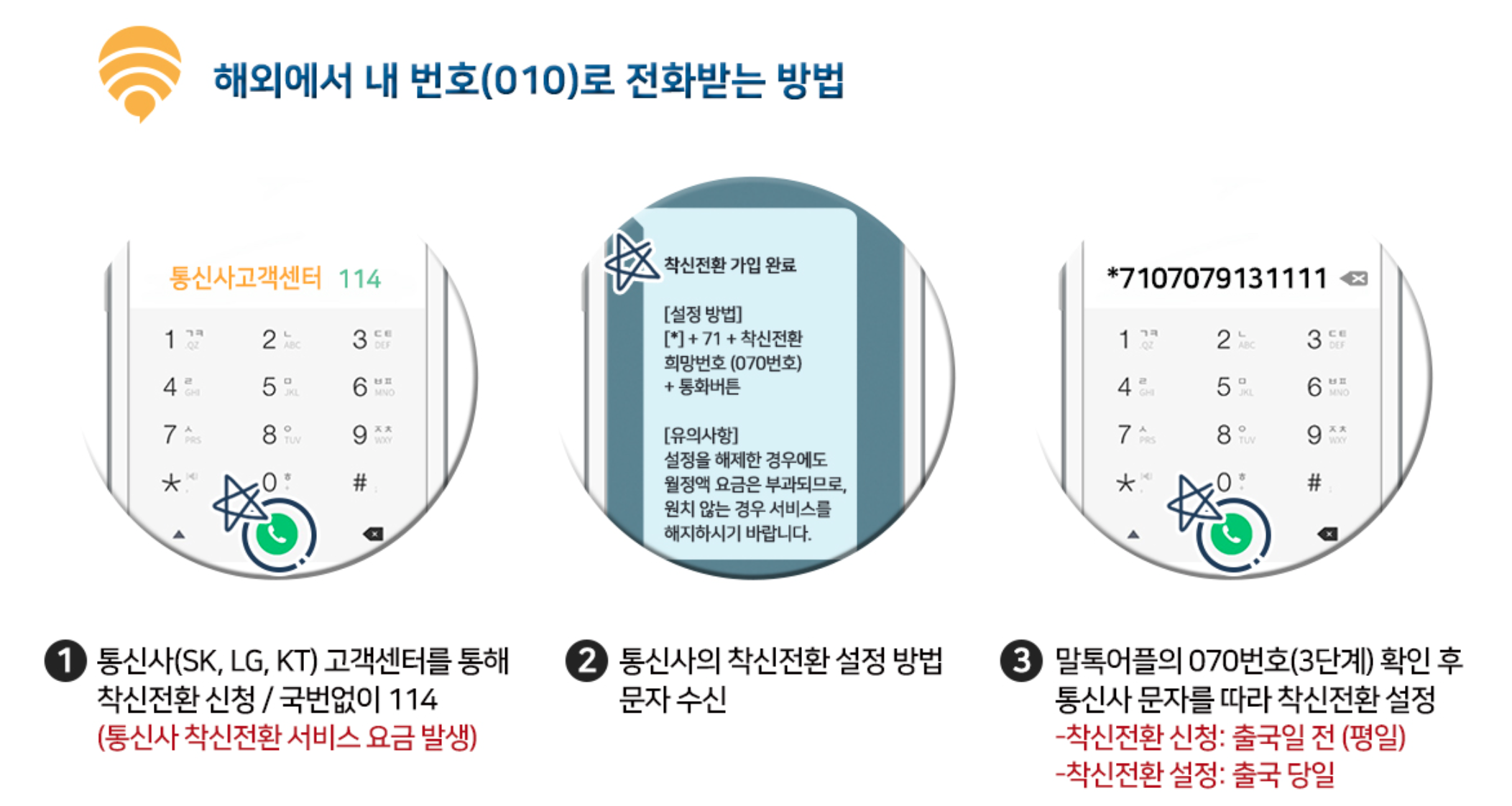 해외에서 기존에 사용하는 010 전화번호로 오는 전화를 받기 위해서는 말톡앱을 통해 부여받은 070 전화번호로 착신전화를 해야 합니다. 기존에 사용하는 010 전화번호를 말톡으로부터 받은 070 번호로 착신 전화를 해 두면 해외에서도 전화를 놓치지 않고 받을 수 있습니다.