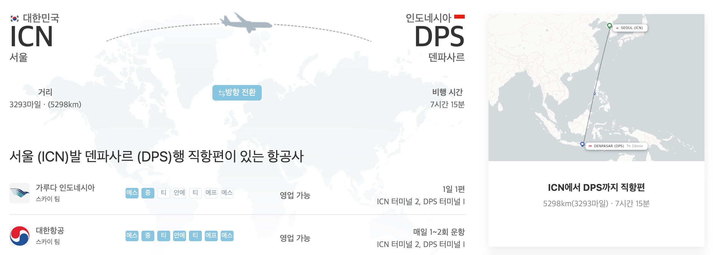 인천국제공항(ICN) 에서 인도네시아 발리 덴파사르 국제공항(DPS)까지는 약 5,298km로 직항편으로 이동할 경우 약 7시간 15분이 소요가 됩니다.