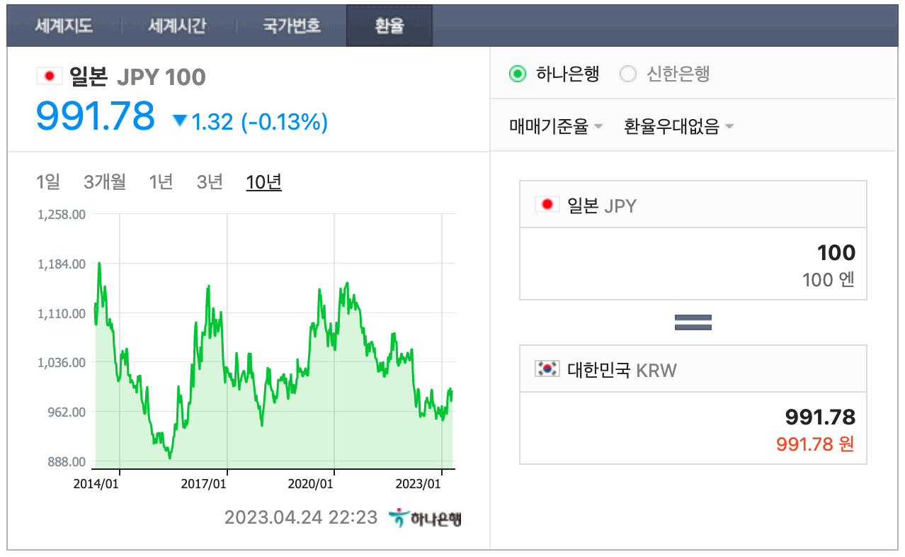 2023년 4월 24일 현재 100엔은 약 992원입니다. 지난 10년 동안의 환율 변화를 봤을 때 100엔 기준으로 900원에 1200원 사입니다. 최근 환율로 보면 100엔은 1천 원으로 생각하면 됩니다.